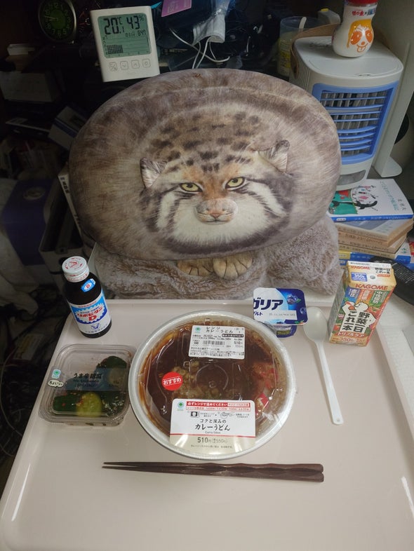 朝食:カップヌードル、旨辛キャベきゅう、リポビタンD、野菜一日これ一本