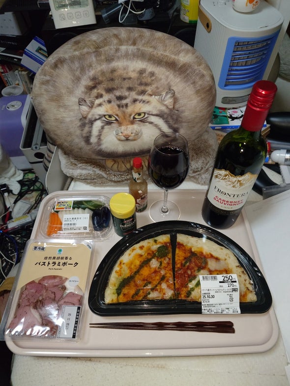 夕食:イタリア産モッツァレラのマルゲリータピザ、パストラミポーク、ぬか漬盛合せ、赤ワイン(FRONTERA CABERNET SAUVIGNON)