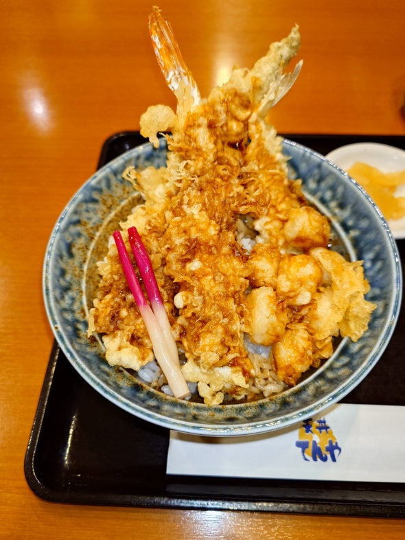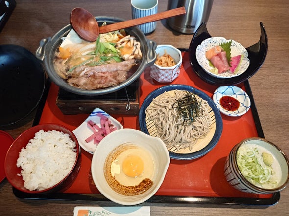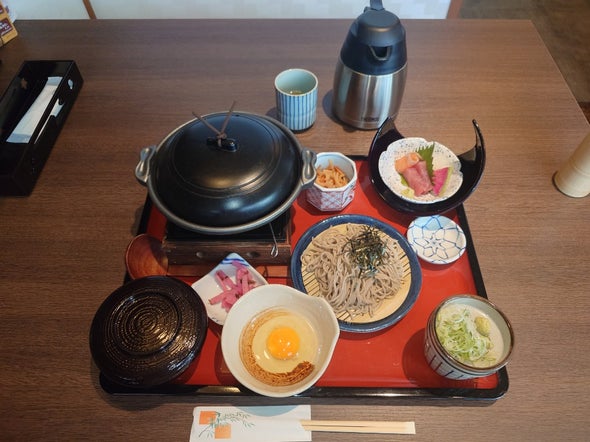 鴨南蛮そば、パストラミポーク、桜えび天、本漬沢庵甘口沢庵