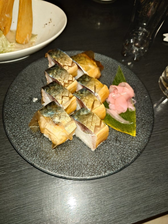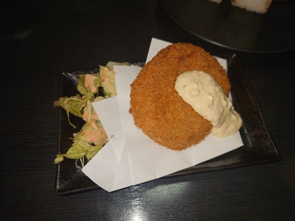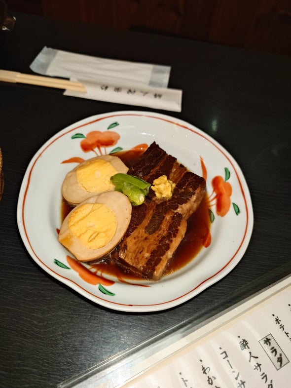 豚の角煮、サラダ、揚げ出し豆腐、鯖の押し寿司、コロッケ、トマトのチーズ焼き、(酔人倶楽部)
