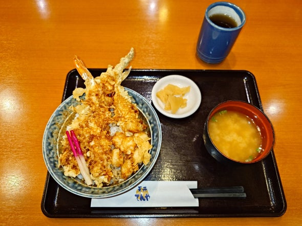 夕食:鴨南蛮そば、パストラミポーク、桜えび天、本漬沢庵甘口沢庵