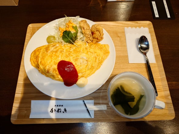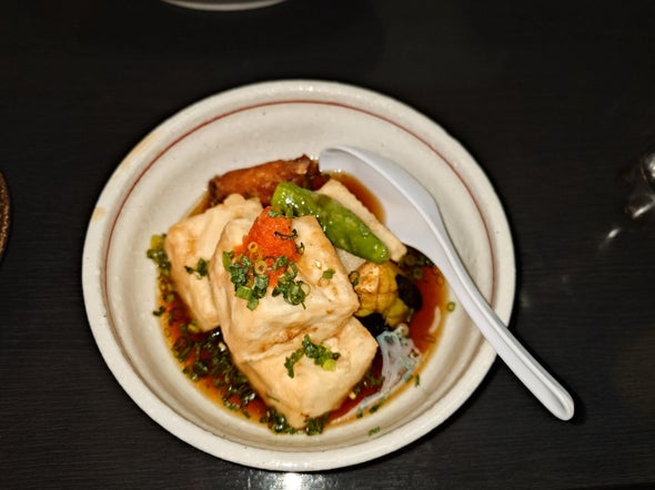 和風だしのカレーうどん、枝豆、パストラミポーク、法蓮草の胡麻和え