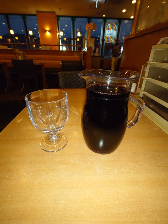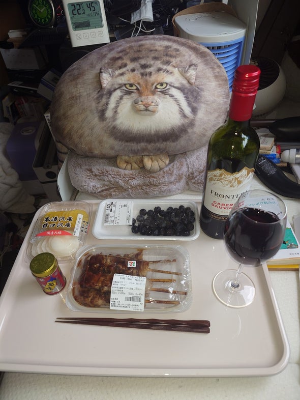 昼食:炭火焼き鳥 もも3本・皮2本入り、生ブルーベリー、本漬沢庵甘口沢庵、赤ワイン(FRONTERA CABERNET SAUVIGNON)