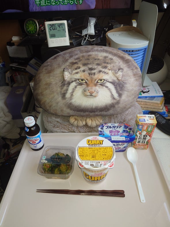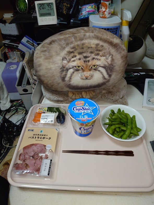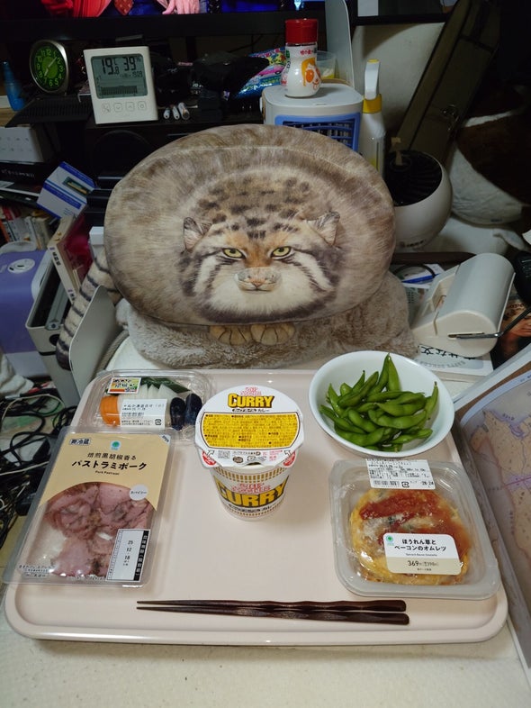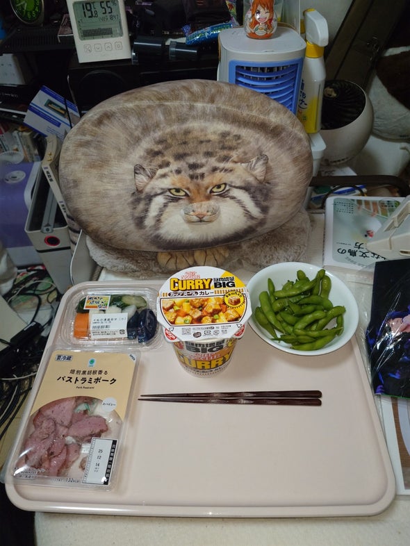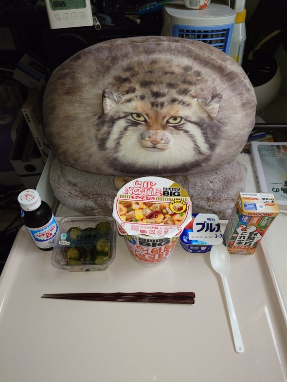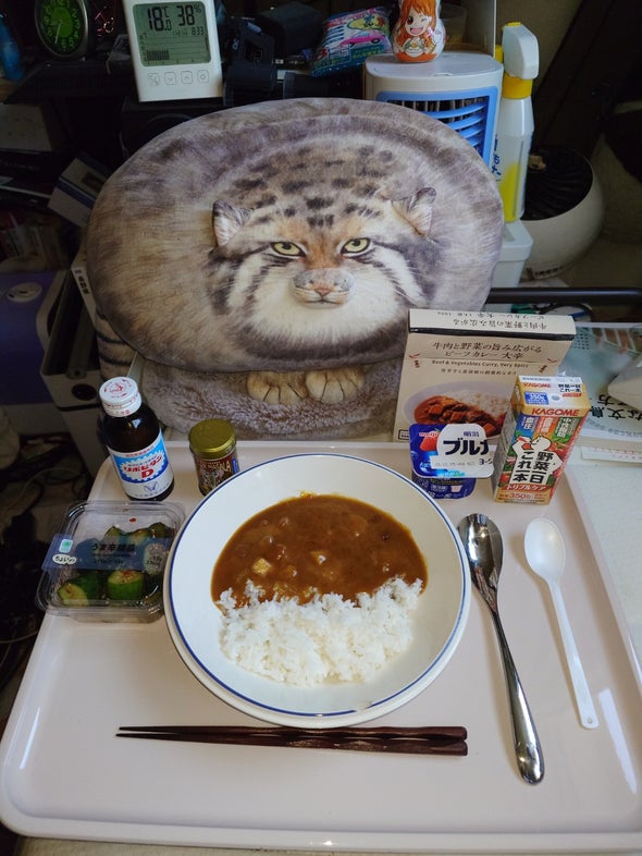 朝食:カップヌードルカレー、うま辛胡瓜、リポビタンD、明治ブルガリアヨーグルトジューシー果実、野菜一日これ一本