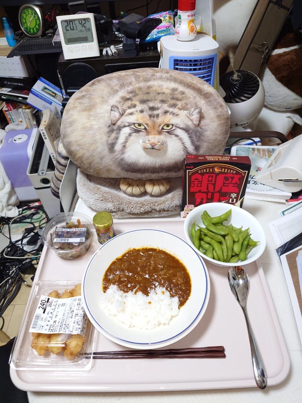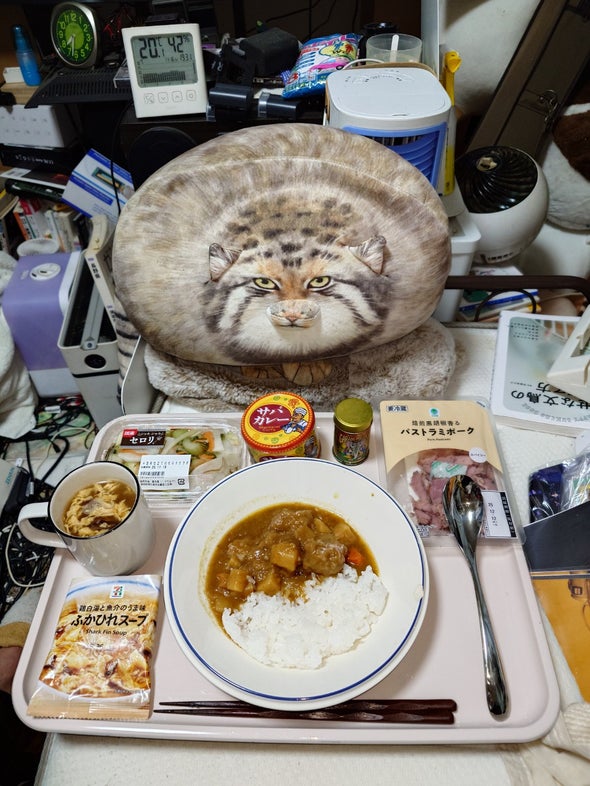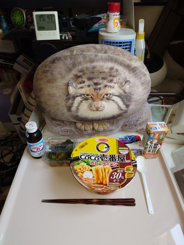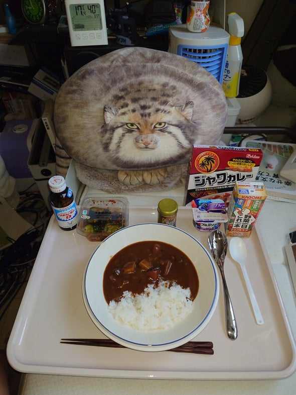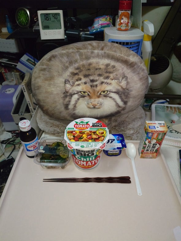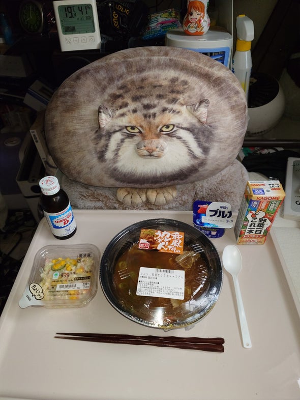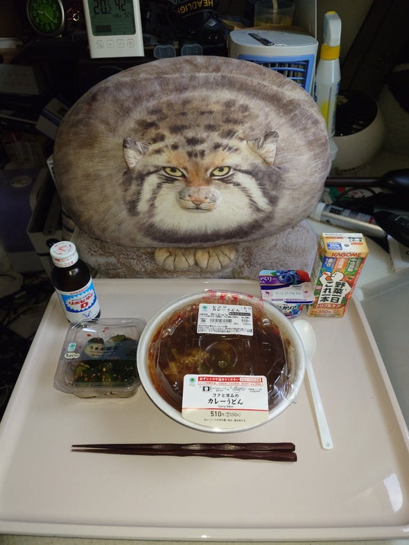 朝食:カップヌードルカレー、うま辛胡瓜、リポビタンD、明治ブルガリアヨーグルトジューシー果実、野菜一日これ一本