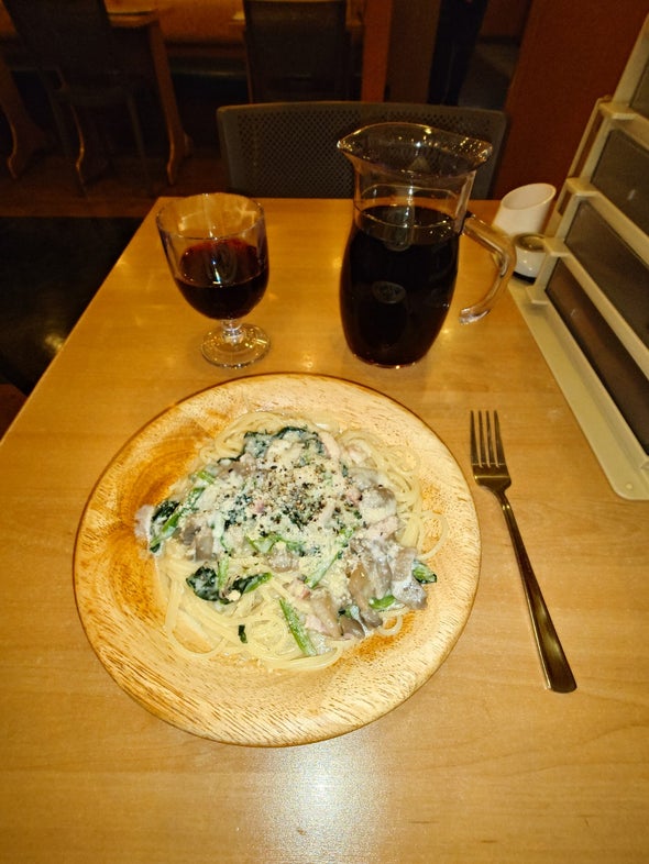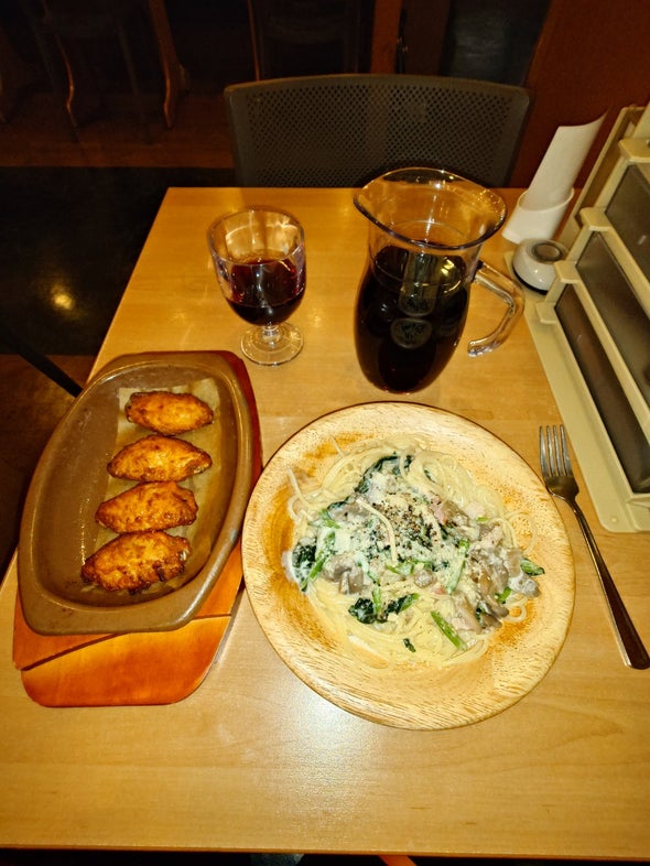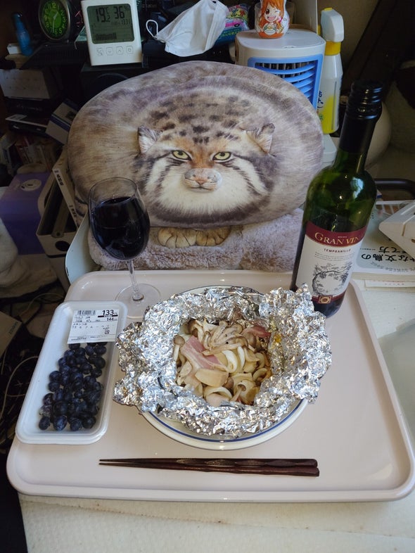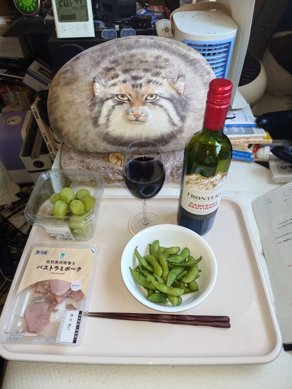 昼食:パストラミポーク、枝豆、シャインマスカット、赤ワイン(SEARIDGE PINOT NOIR)