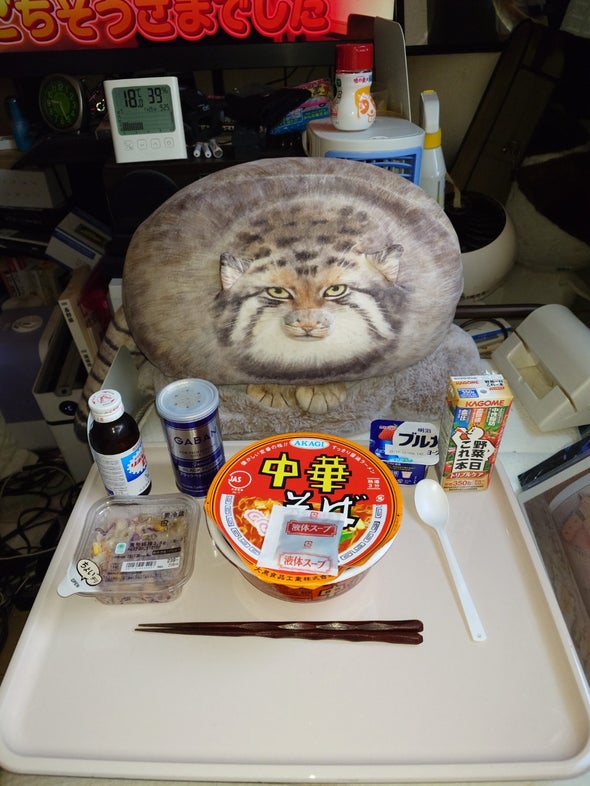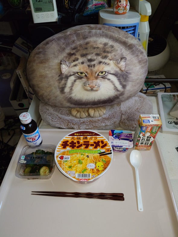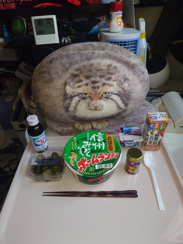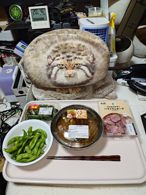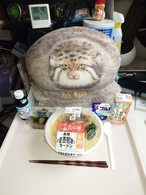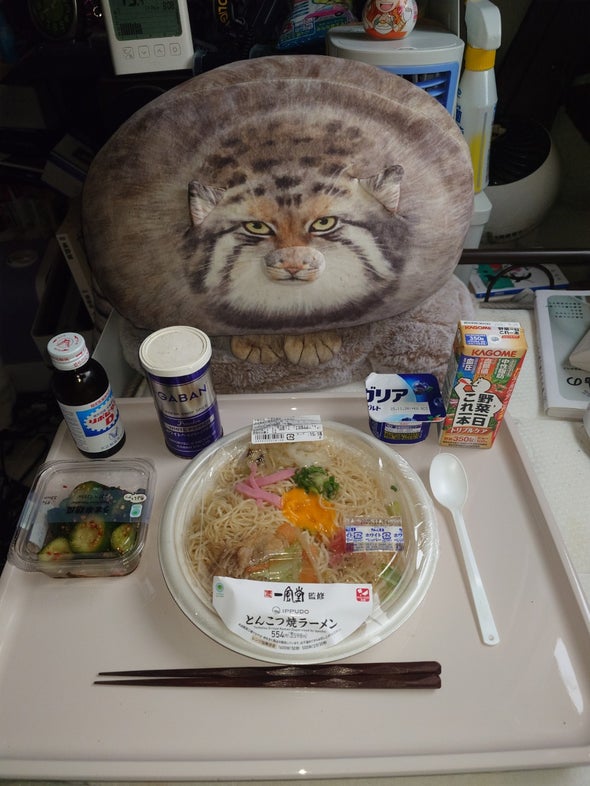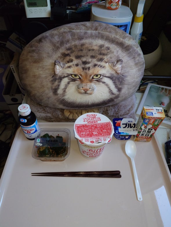 朝食:あっさり本格中華そば、うま辛胡瓜、リポビタンD、明治ブルガリアヨーグルトブルーベリーミックス、野菜一日これ一本