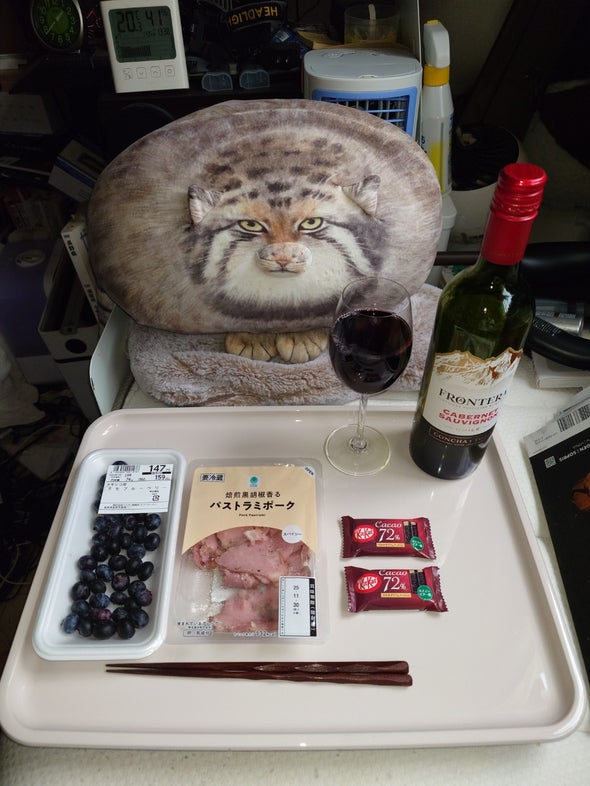 昼食:パストラミポーク、KitKat、生ブルーベリー、赤ワイン(SEARIDGE PINOT NOIR)