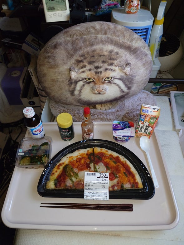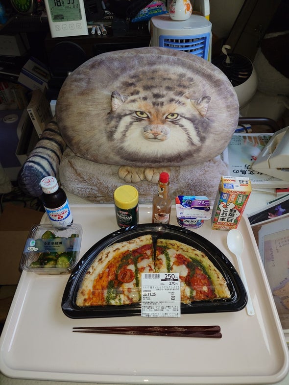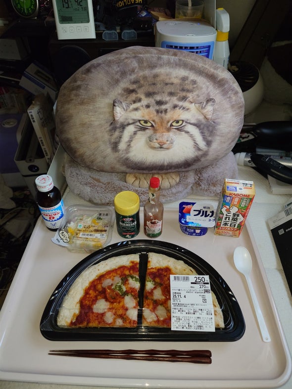朝食:イタリア産モッツァレラのマルゲリータピザ、コールスローサラダ、リポビタンD、明治ブルガリアヨーグルトブルーベリーミックス、野菜一日これ一本