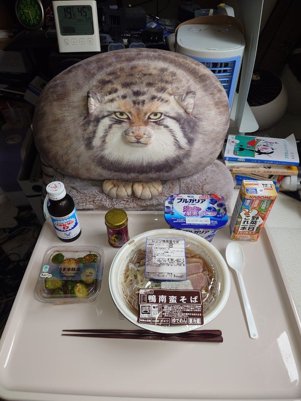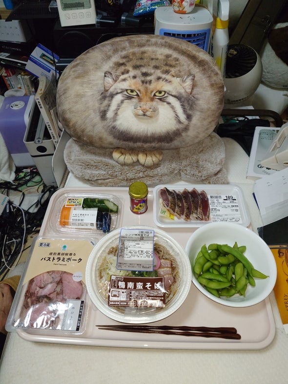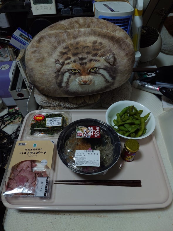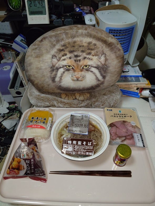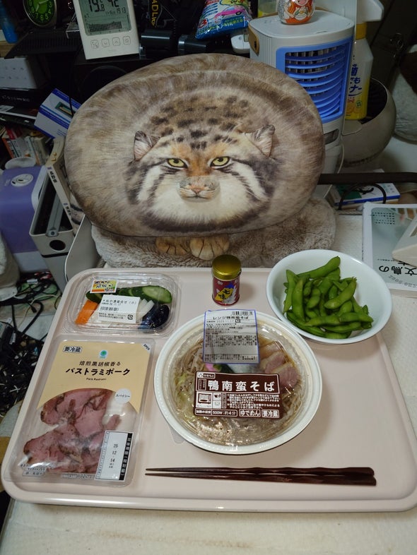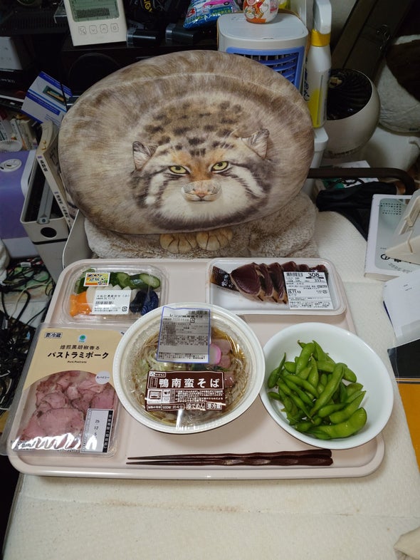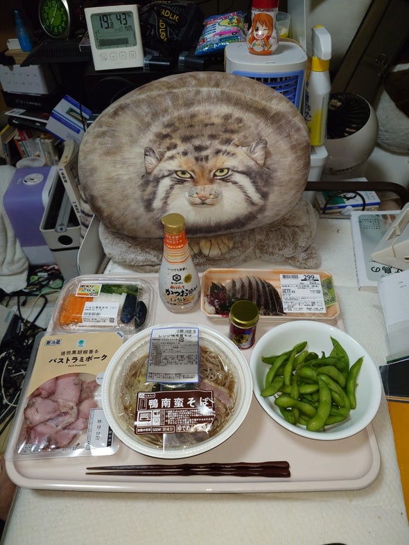 朝食:カ鴨南蛮そば、うま辛胡瓜、リポビタンD、明治ブルガリアヨーグルトジューシー果実、野菜一日これ一本