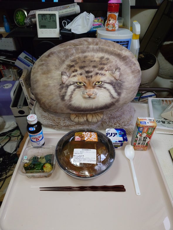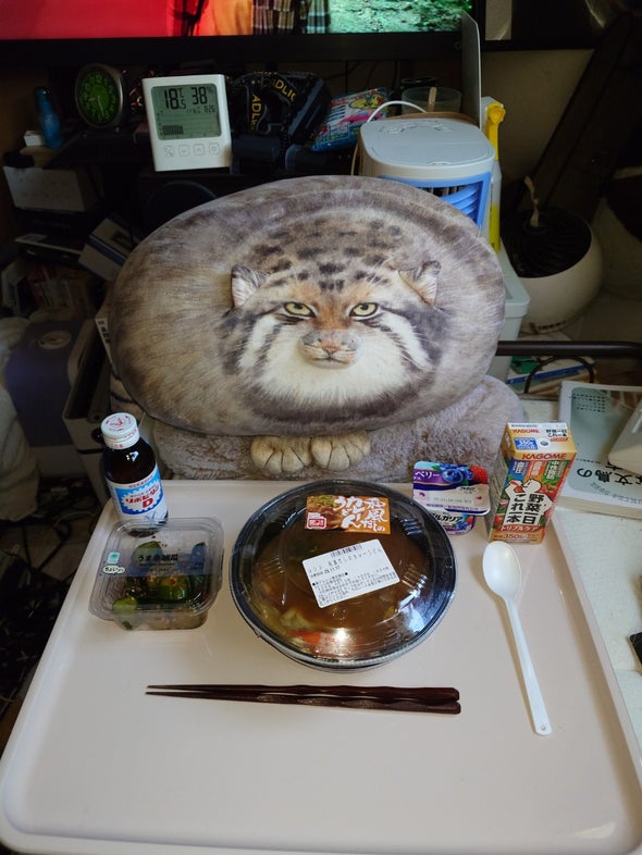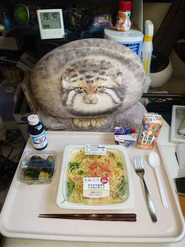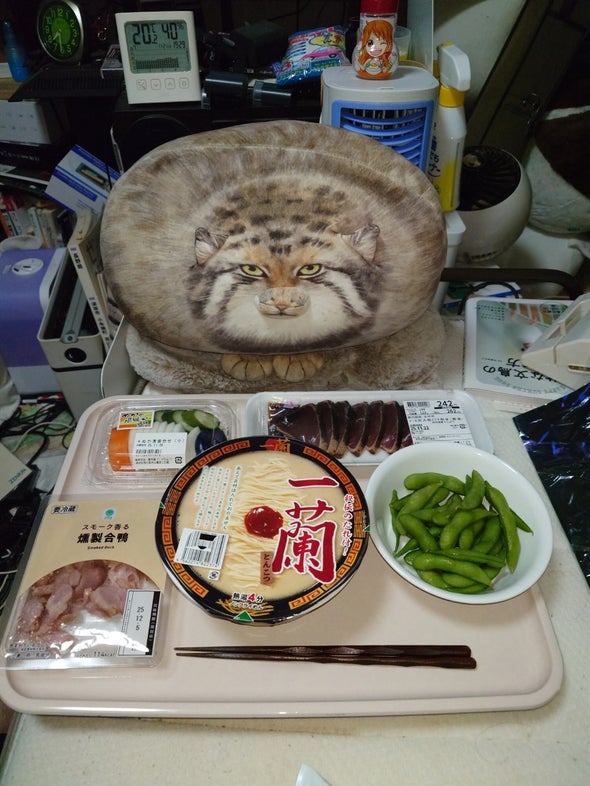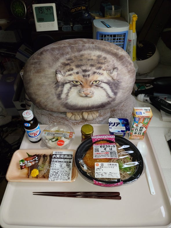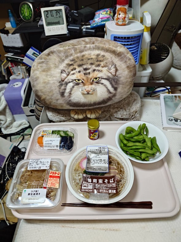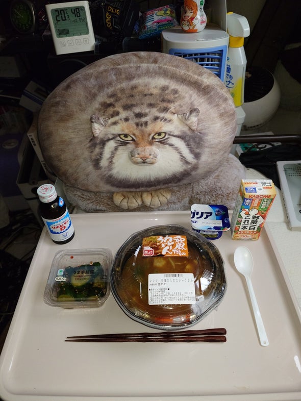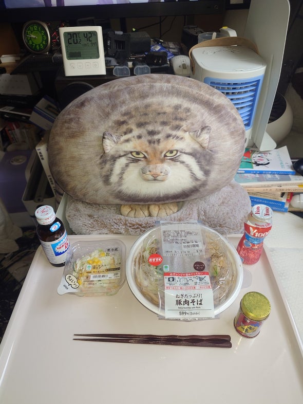 朝食:カ鴨南蛮そば、うま辛胡瓜、リポビタンD、明治ブルガリアヨーグルトジューシー果実、野菜一日これ一本