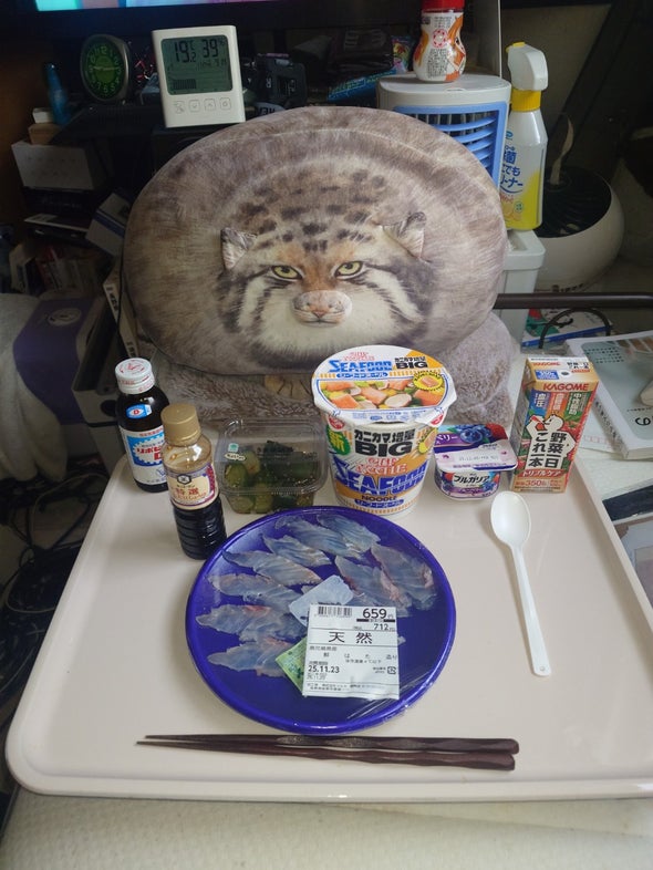 朝食:野菜コロッケそば、かつおたたき 大葉にんにく醤油、山梨県富士川町産ゆず使用ゆず大根、明治ブルガリアヨーグルトブルーベリーミックス、野菜一日これ一本