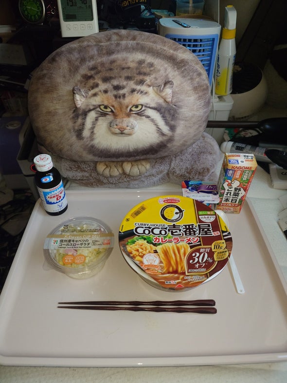 朝食:CoCo壱番屋監修カレーラーメン、信州産キャベツのコールスローサラダ、リポビタンD、明治ブルガリアヨーグルトブルーベリーミックス、野菜一日これ一本