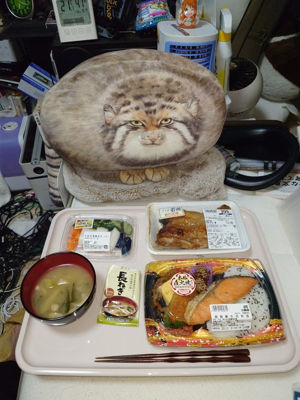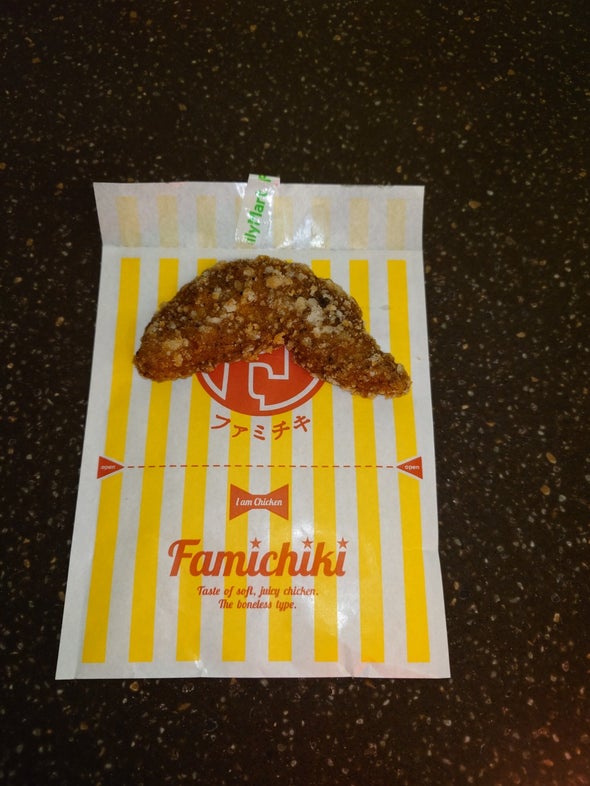 昼食:手仕込みチキンカツ&わかめご飯弁当、国産いかなんこつ、黒霧島