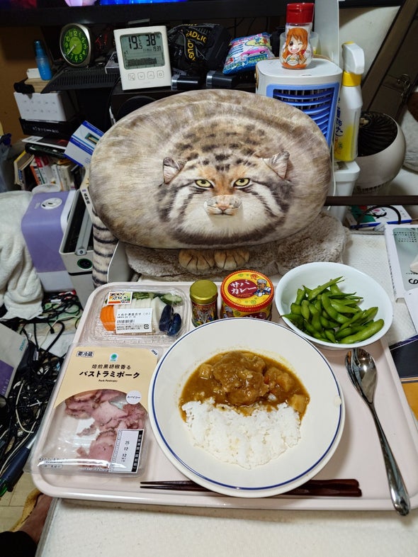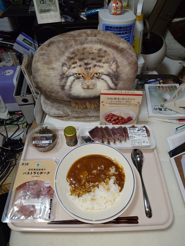 夕食:カレーライス、枝豆、パストラミポーク、ぬか漬盛合せ