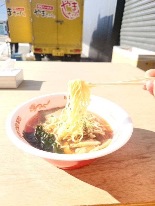 中華そば、5品目野菜のごまマヨサラダ、リポビタンD、明治ブルガリアヨーグルトブルーベリーミックス、野菜一日これ一本