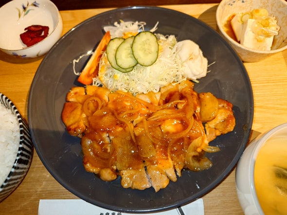 朝食:豚ロース生姜焼重、豆腐と枝豆のひじき和え、リポビタンD、明治ブルガリアヨーグルトブルーベリーミックス、野菜一日これ一本