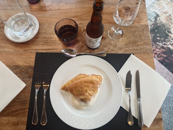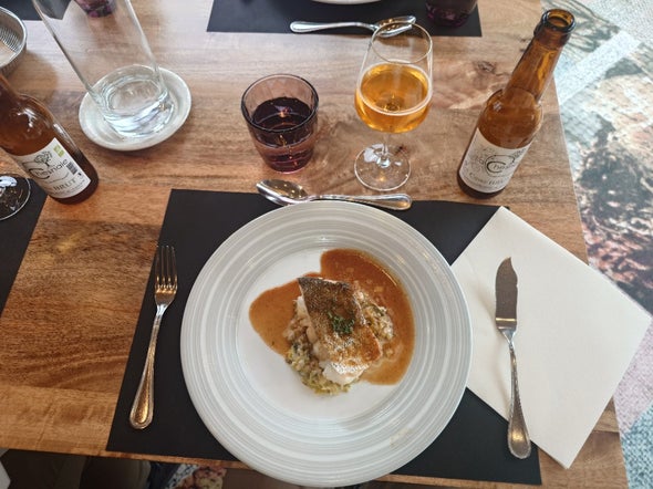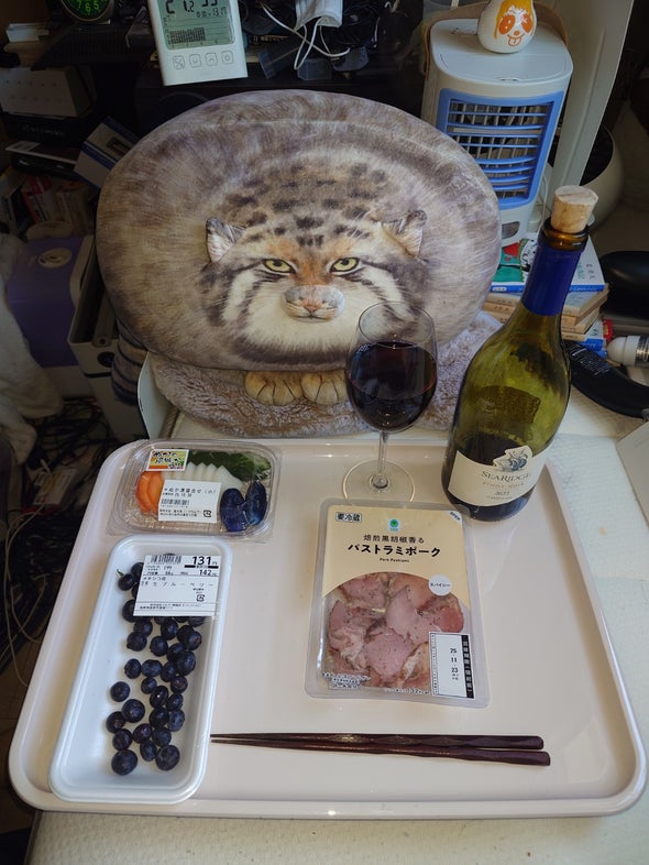 昼食:パストラミポーク、生ブルーベリー、ぬか漬盛合せ、赤ワイン(SEARIDGE PINOT NOIR)