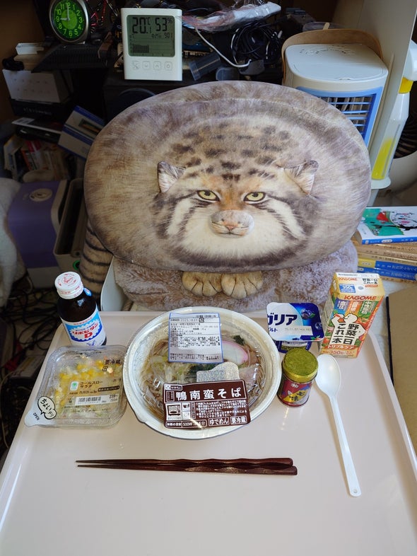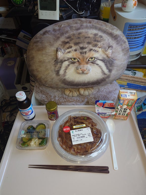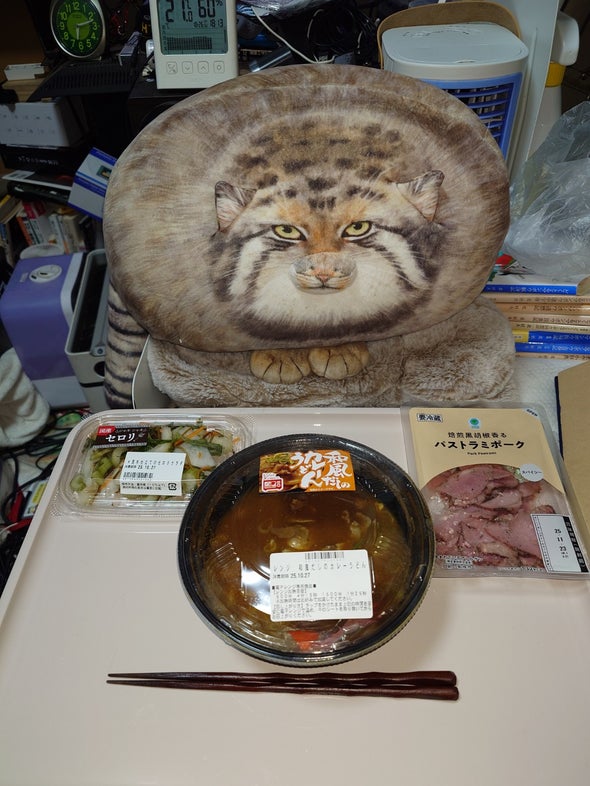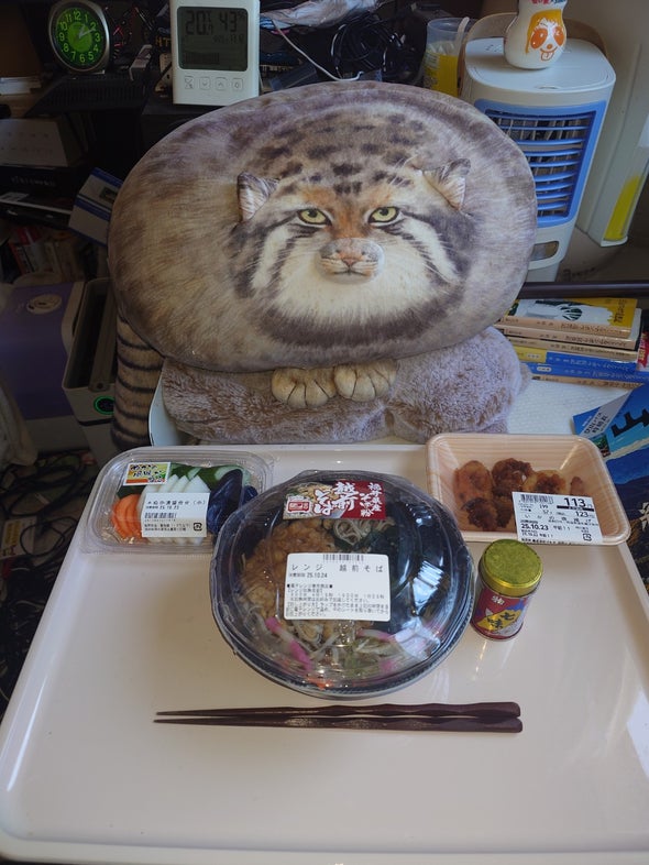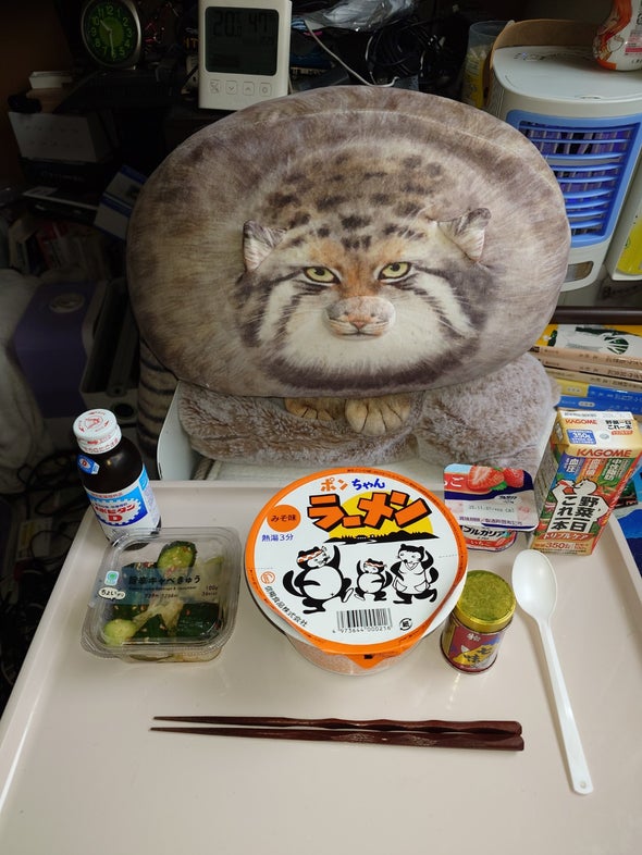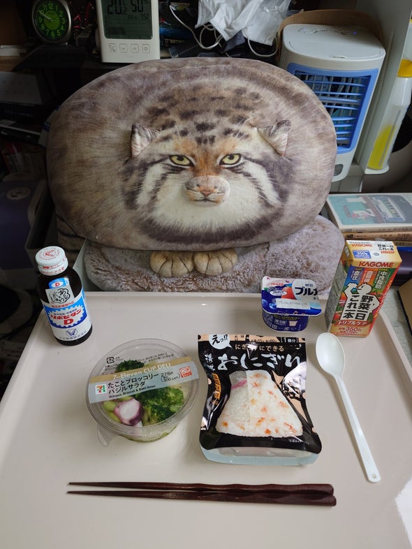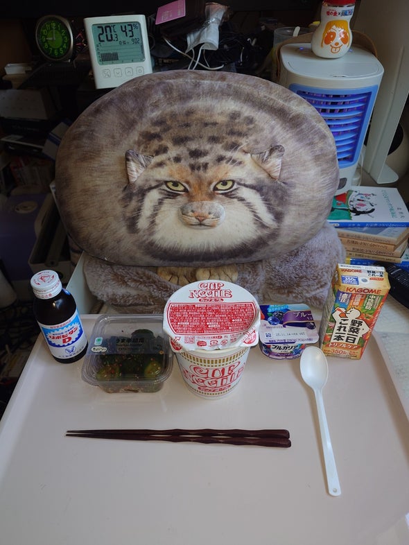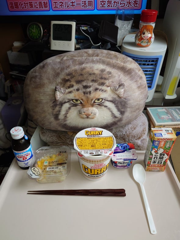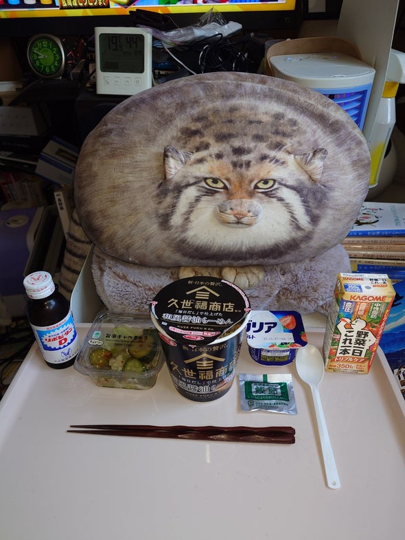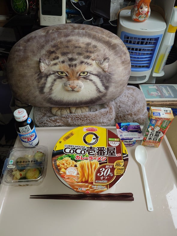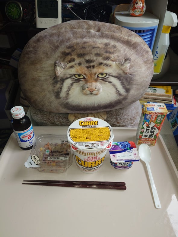 朝食:カップヌードル、うま辛胡瓜、リポビタンD、明治ブルガリアヨーグルトブルーベリーミックス、野菜一日これ一本