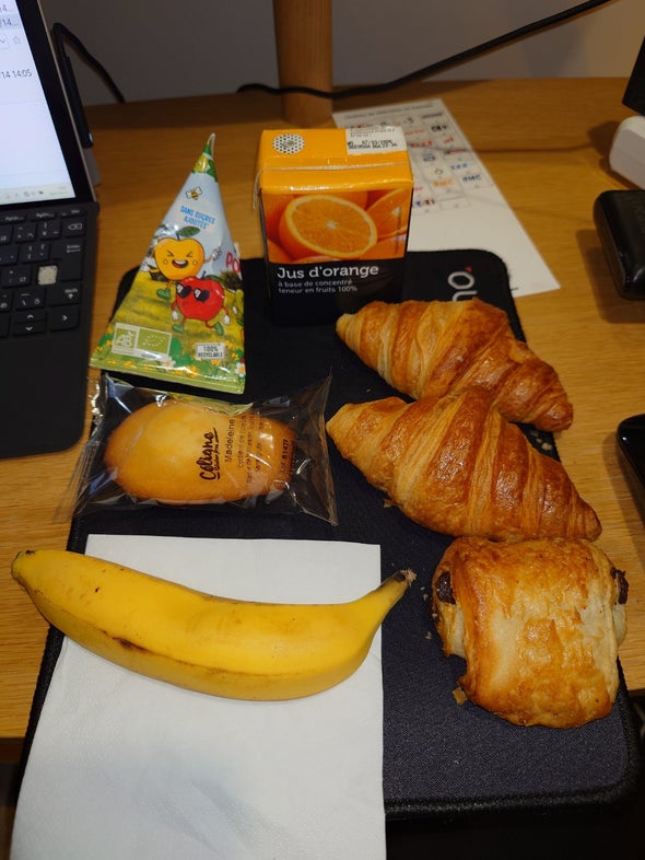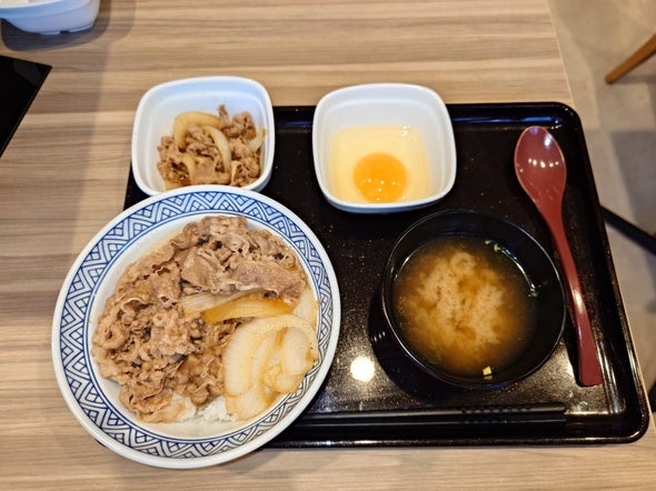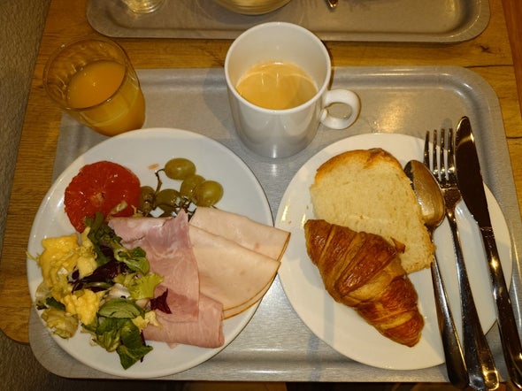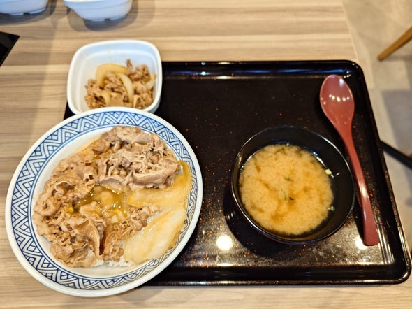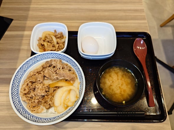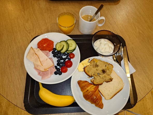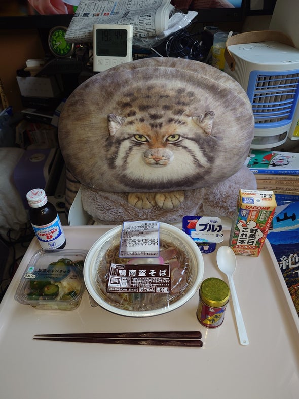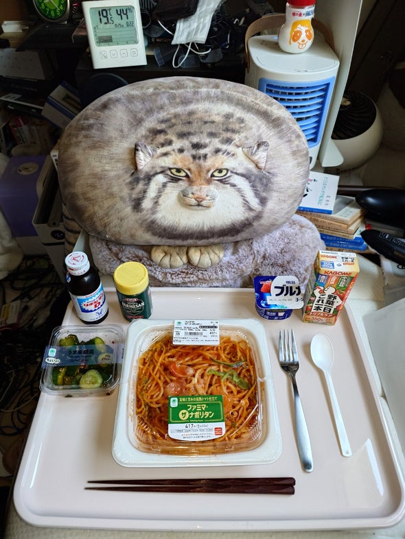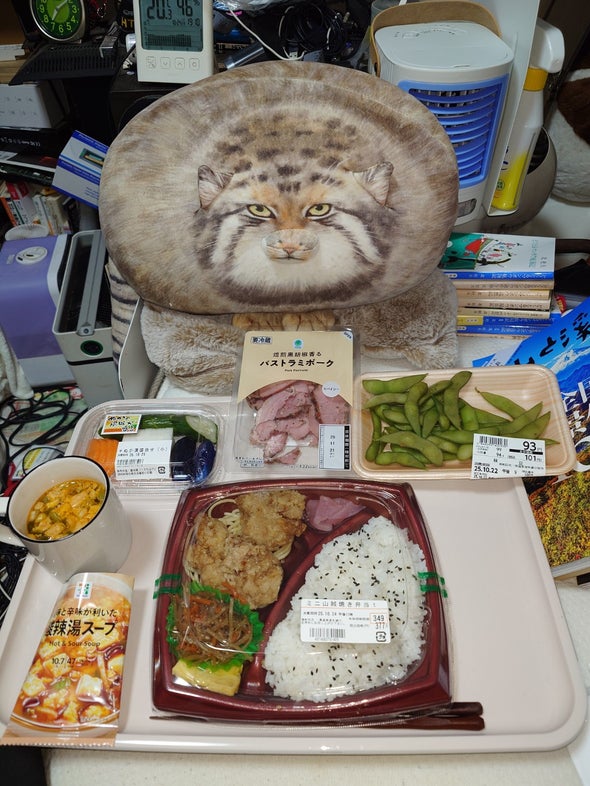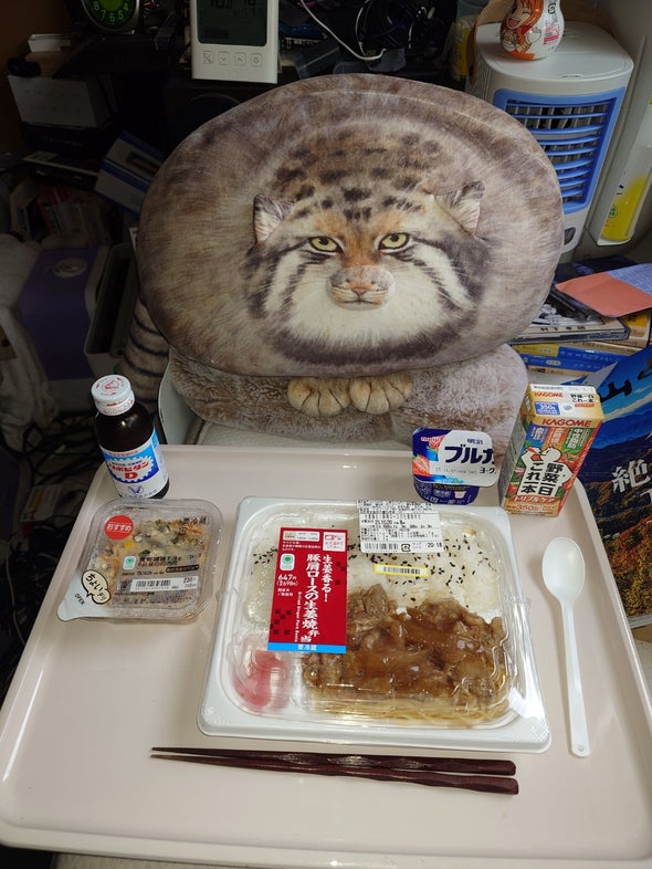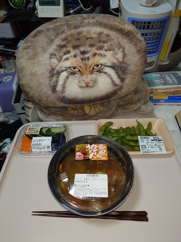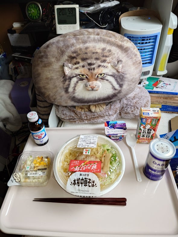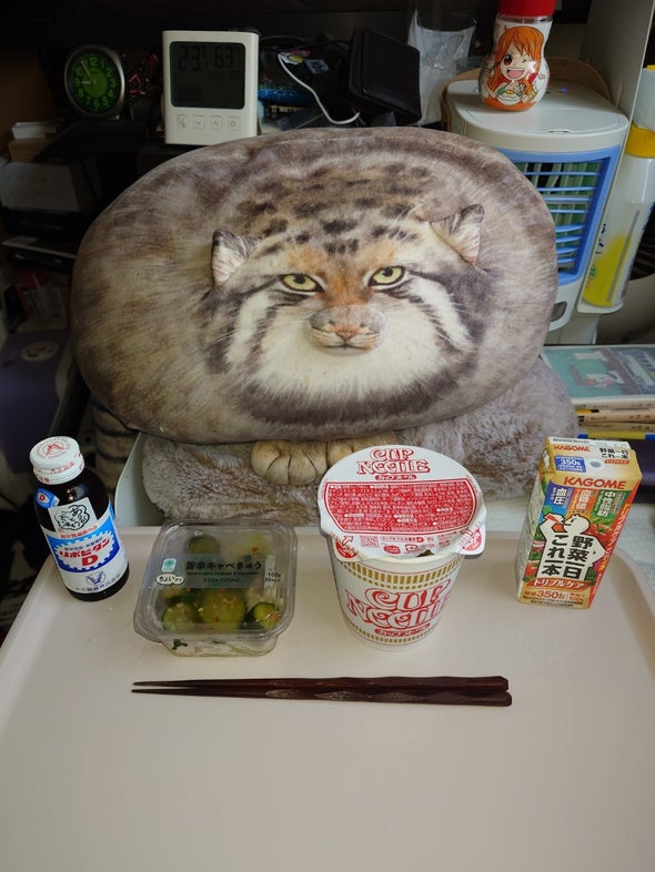 朝食:カップヌードル、うま辛胡瓜、リポビタンD、明治ブルガリアヨーグルトブルーベリーミックス、野菜一日これ一本