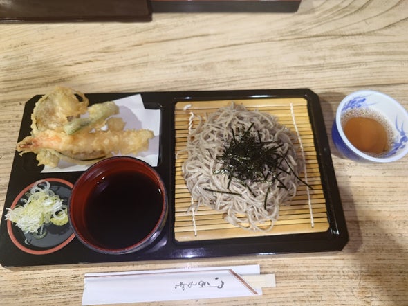 鴨南蛮そば、舞茸天ぷら、和歌山県産活〆真鯛刺身、おつまみスパイシー胡瓜