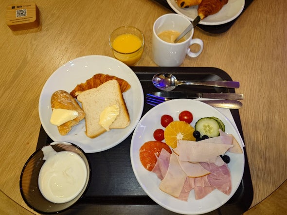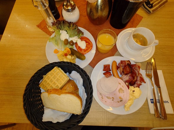 朝食:ファミマ・ザ・ナポリタン、うま辛胡瓜、リポビタンD、明治ブルガリアヨーグルトブルーベリーミックス、野菜一日これ一本
