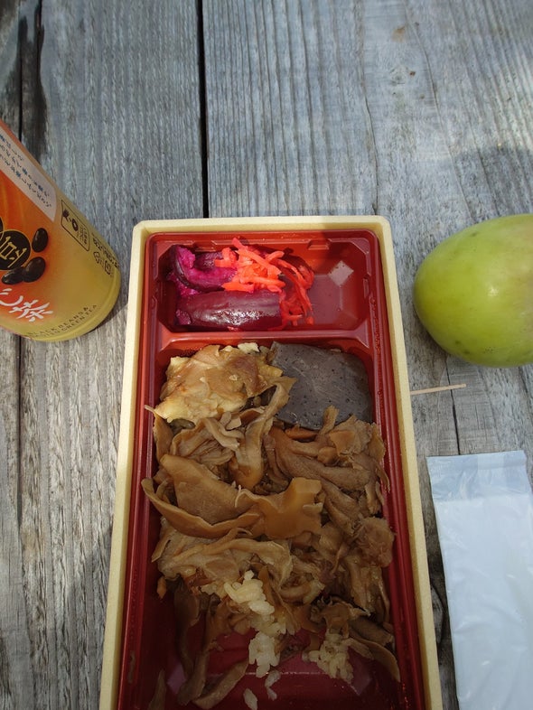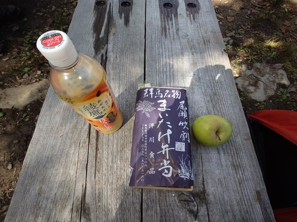 信州名物からし稲荷、5品目野菜のごまマヨサラダ、リポビタンD、明治ブルガリアヨーグルトブルーベリー、野菜一日これ一本、なめこの味噌汁