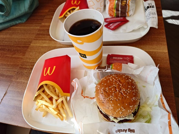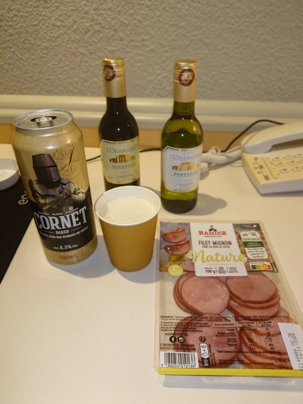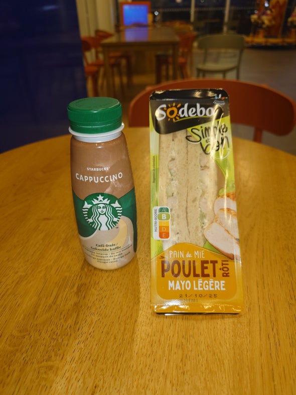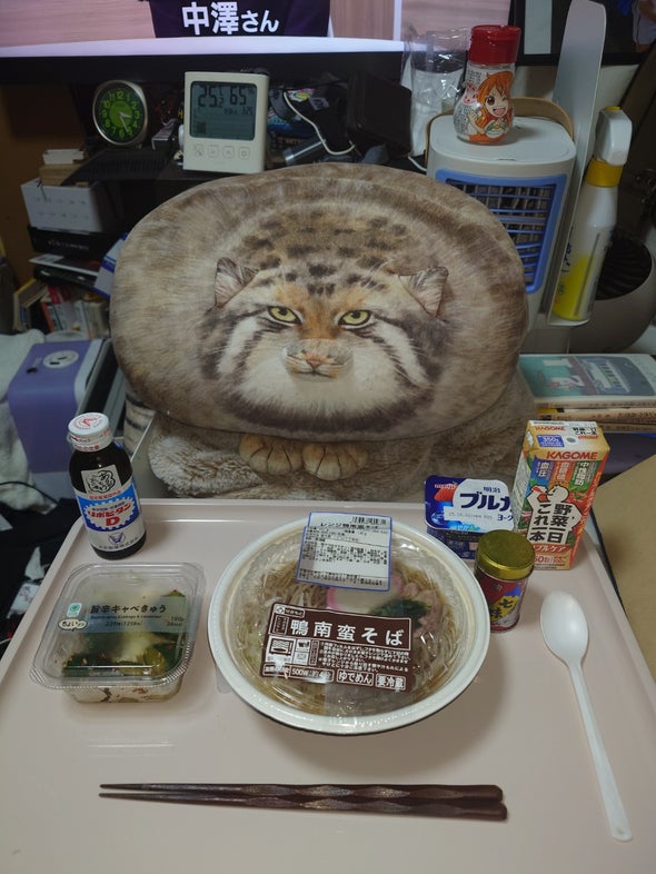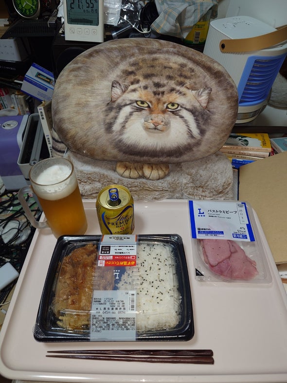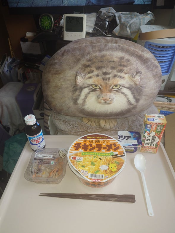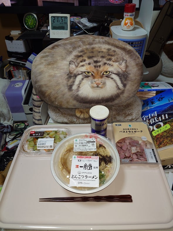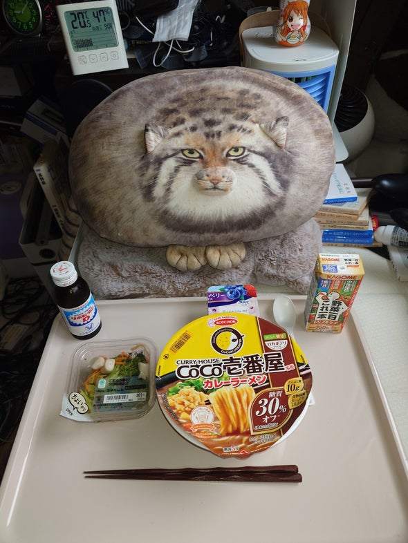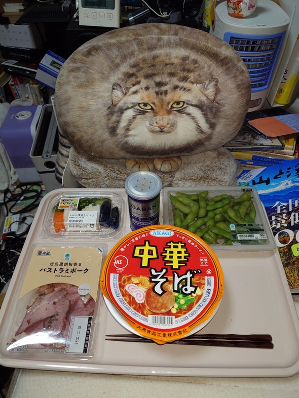 朝食:カップヌードル、旨辛キャベきゅう、リポビタンD、野菜一日これ一本