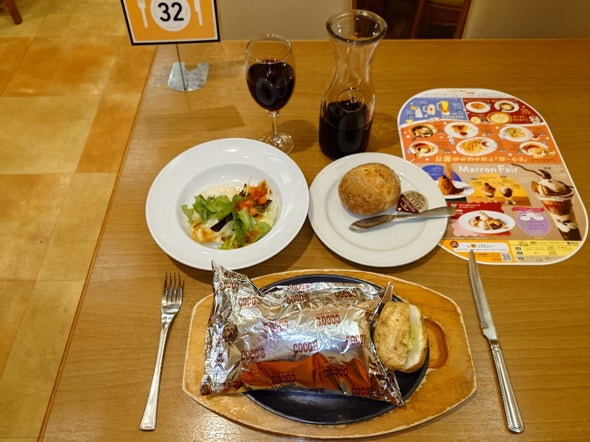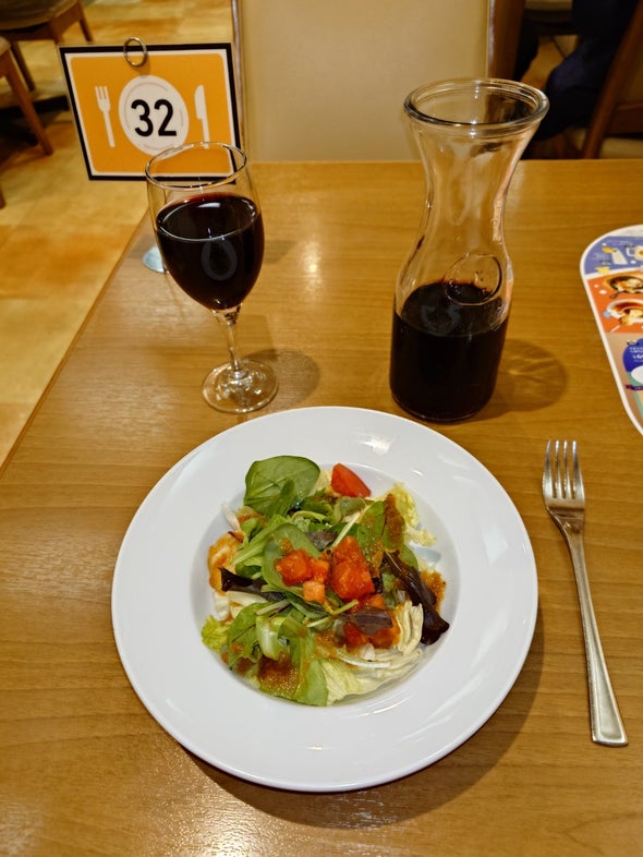夕食:濃厚ビーフシチューの包み焼きハンバーグ ダブル Fセット、彩り野菜のグリーンサラダ、デカンタ赤 (ココス 長野柳町店)