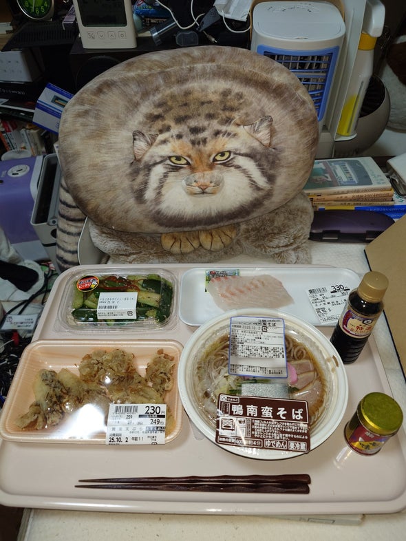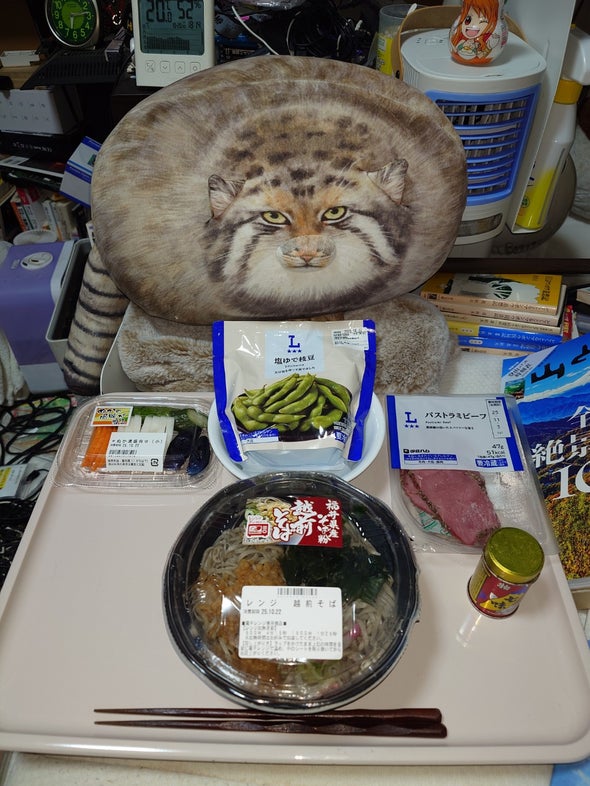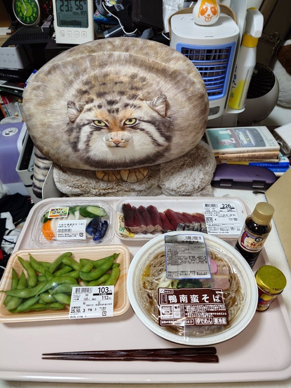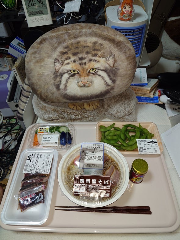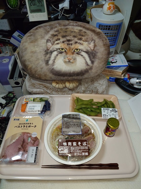 夕食:鴨南蛮そば、枝豆、パストラミポーク、ぬか漬盛合せ