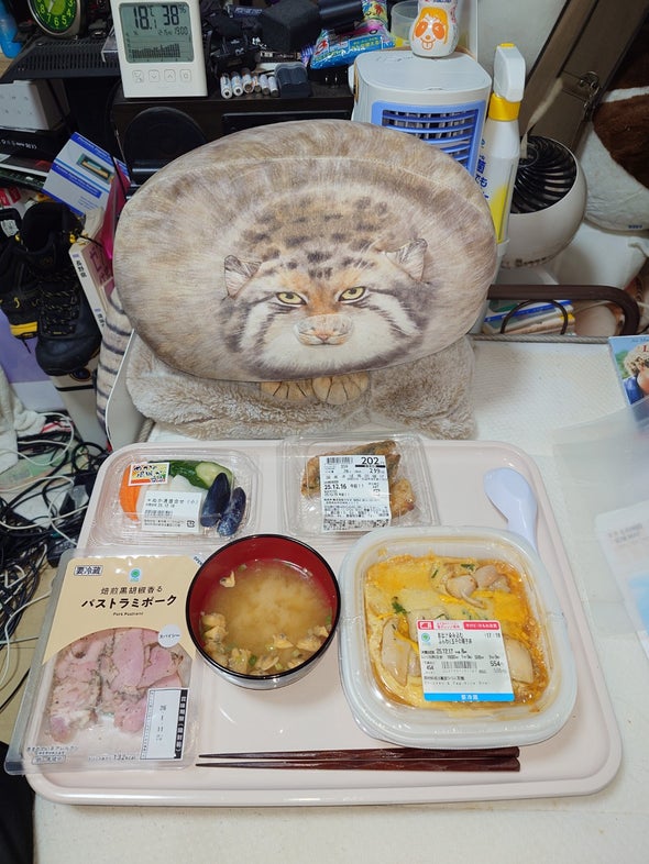 夕食:お出汁染み込むふんわり玉子の親子丼、国産さば竜田揚げ、パストラミポーク、ぬか漬盛合せ