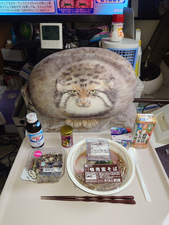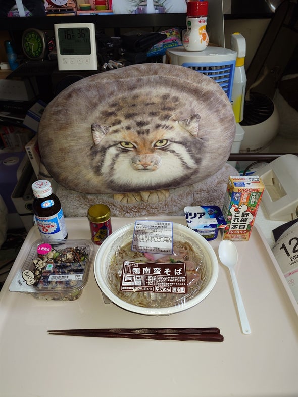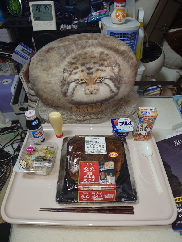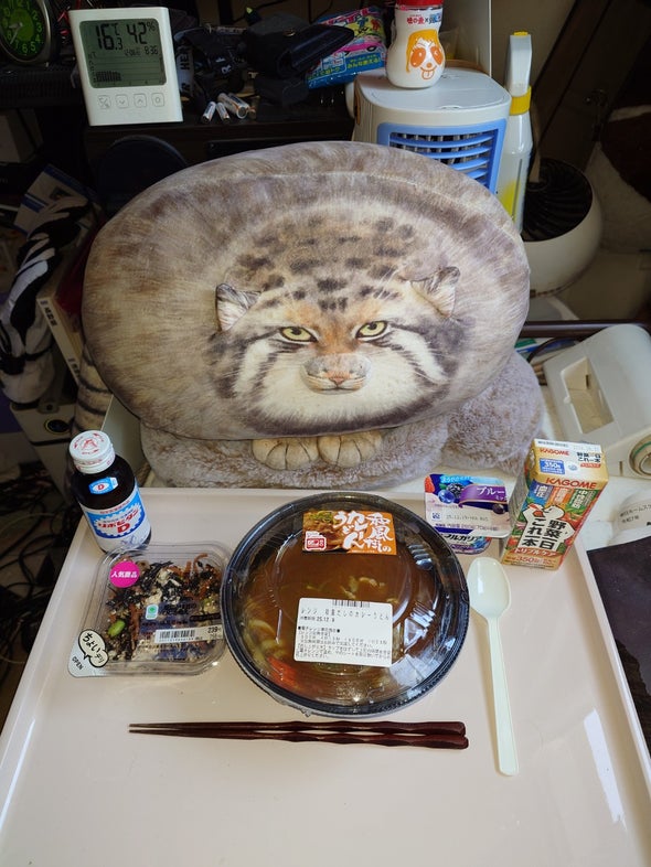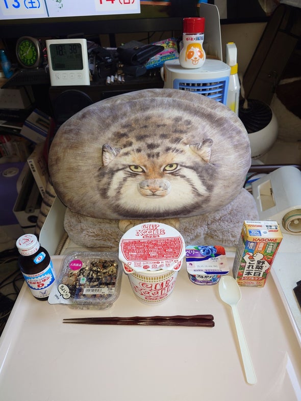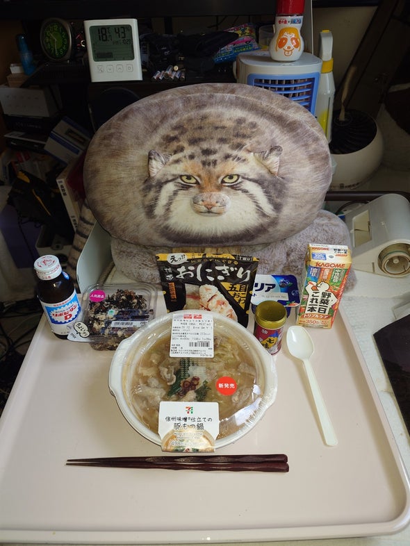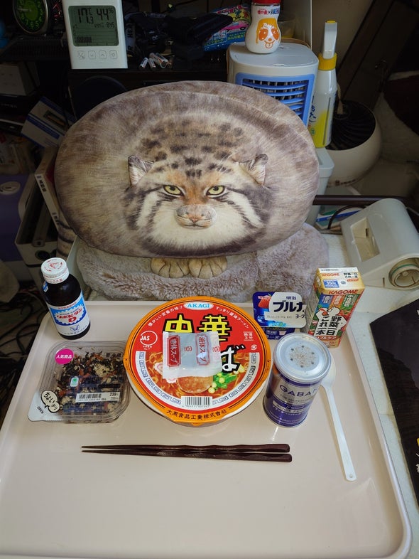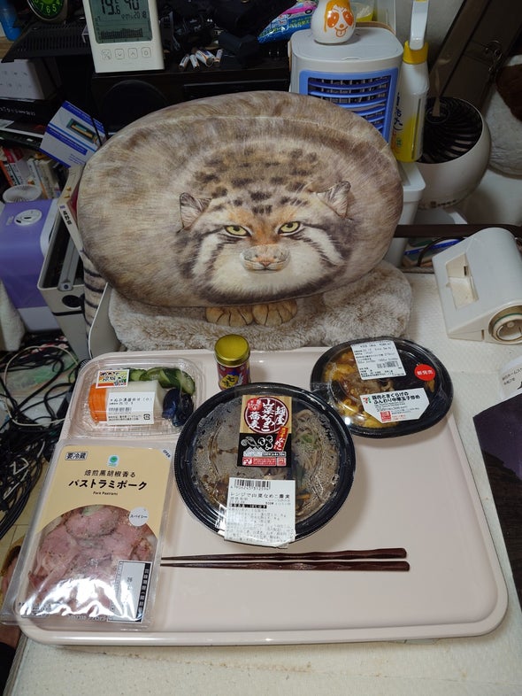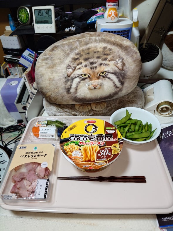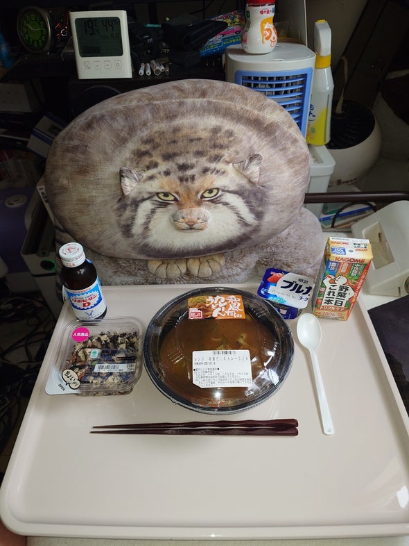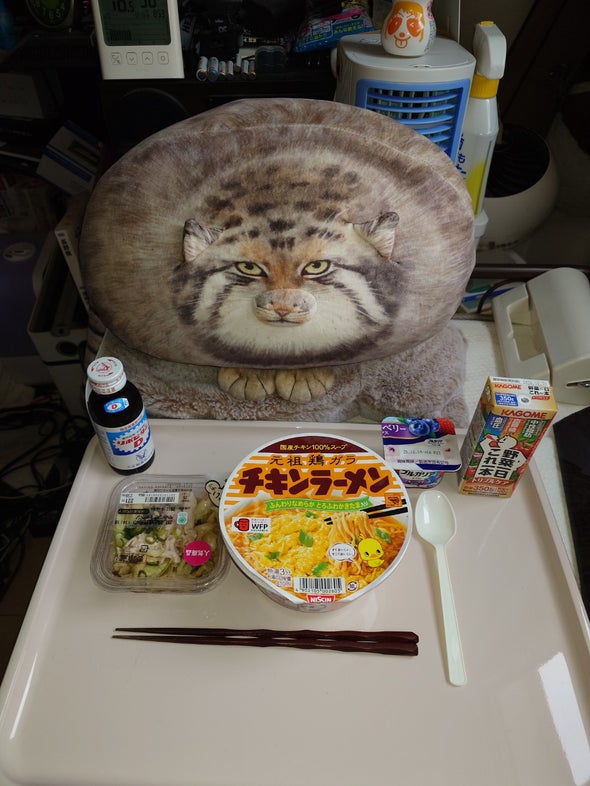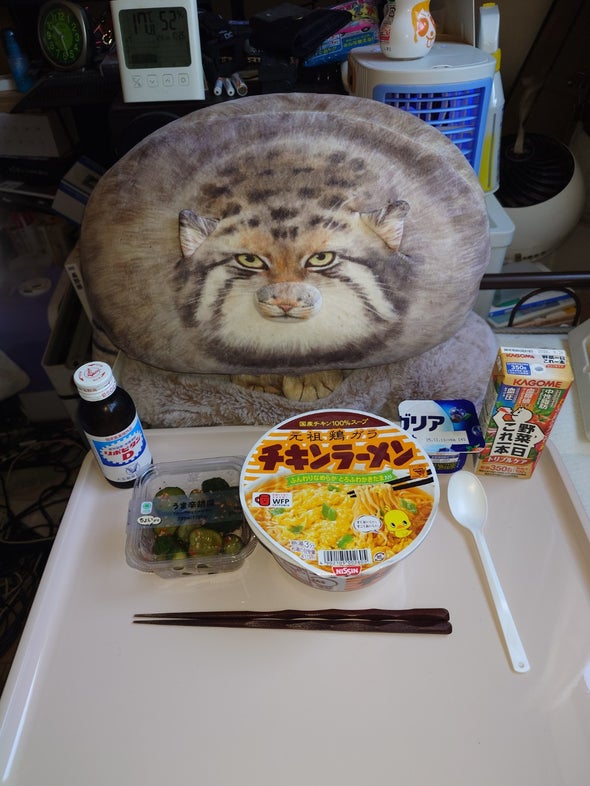 朝食:チキンラーメン、うま辛胡瓜、リポビタンD、明治ブルガリアヨーグルトブルーベリーミックス、野菜一日これ一本