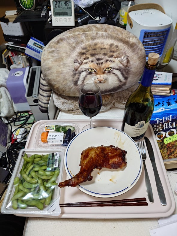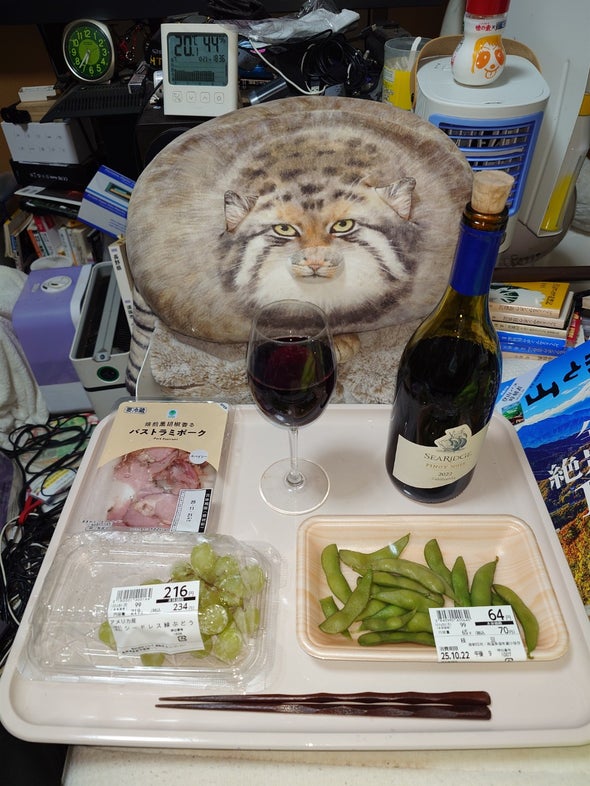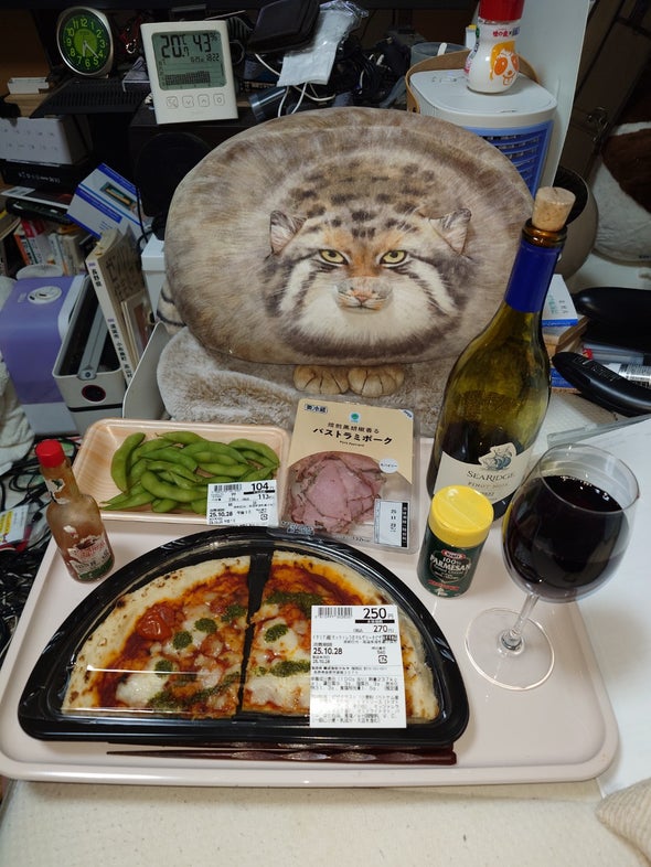 夕食:イタリア産モッツァレラのマルゲリータピザ、枝豆、パストラミポーク、赤ワイン(SEARIDGE PINOT NOIR)