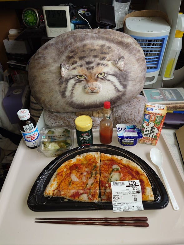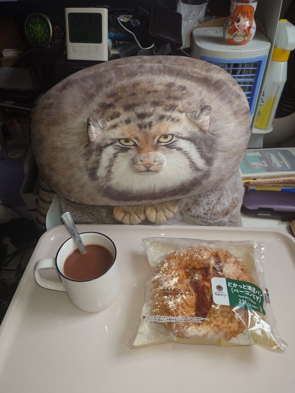 昼食:どかっと満足パン(ベーコンピザ)、ミルクココア