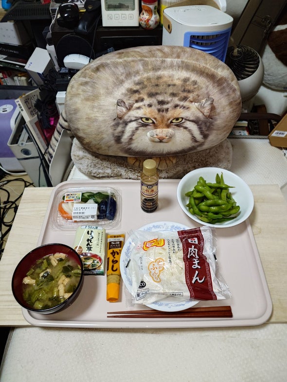肉まん、枝豆、ぬか漬盛合せ、ほうれん草の味噌汁