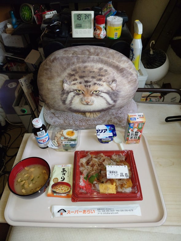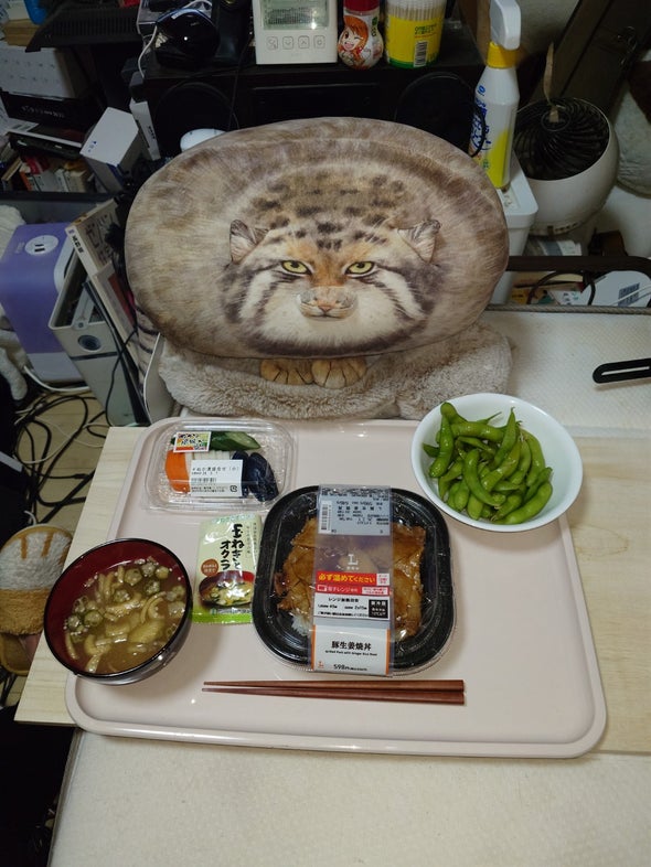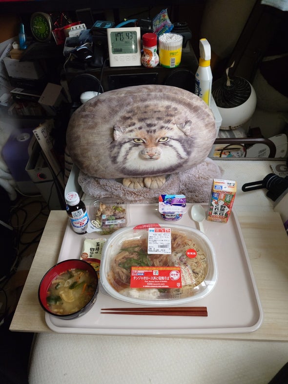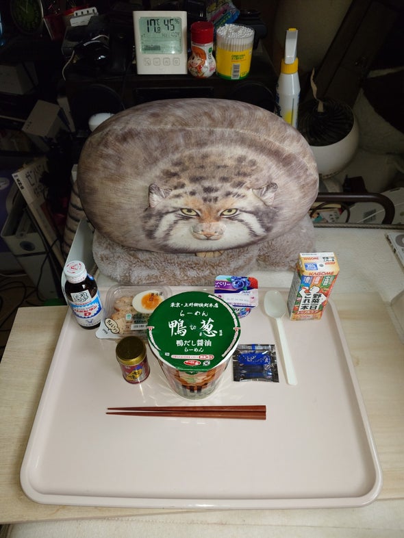朝食:一蘭とんこつ、チキン&たまご&ブロッコリー、リポビタンD、明治ブルガリアヨーグルトブルーベリーミックス、野菜一日これ一本