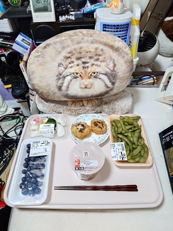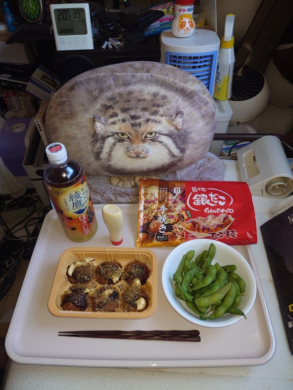 昼食:たこ焼、枝豆、綾鷹黒豆ほうじ茶