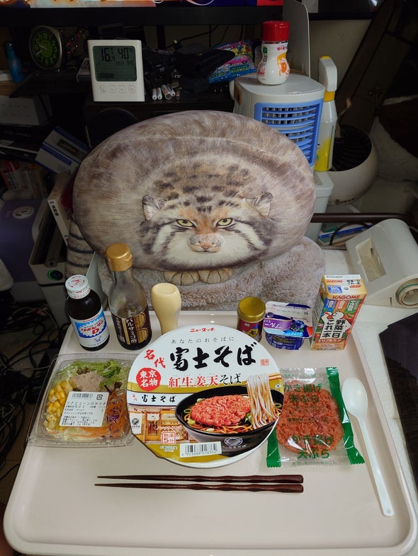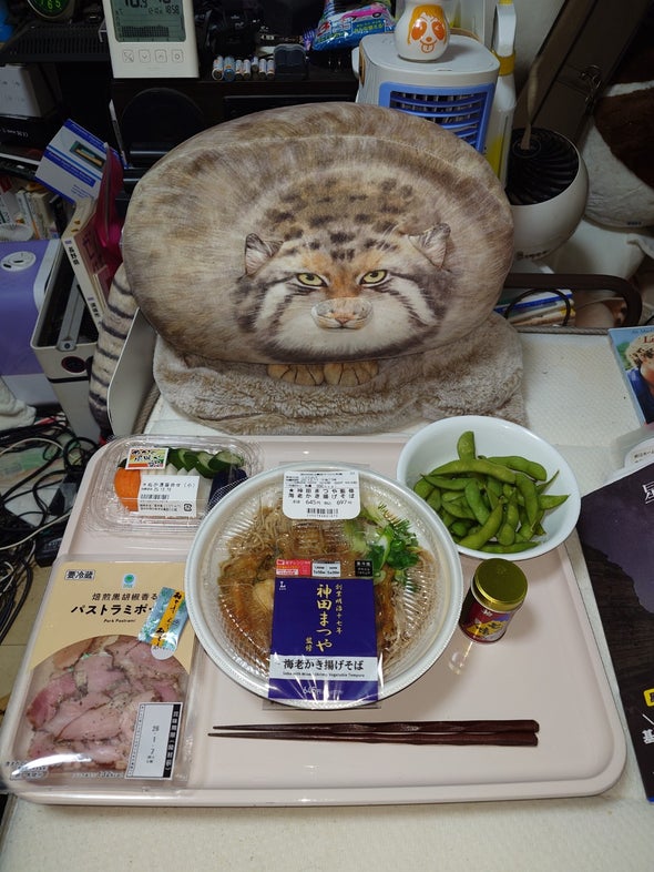 朝食:名代富士そば紅生姜天そば、ツナとコーンのサラダ、リポビタンD、明治ブルガリアヨーグルトブルーベリーミックス、野菜一日これ一本