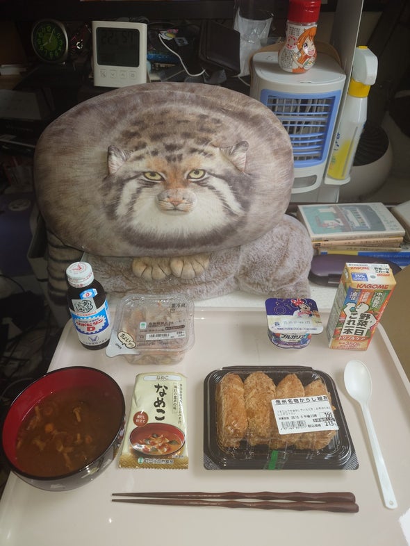 朝食:信州名物からし稲荷、5品目野菜のごまマヨサラダ、リポビタンD、明治ブルガリアヨーグルトブルーベリー、野菜一日これ一本、なめこの味噌汁