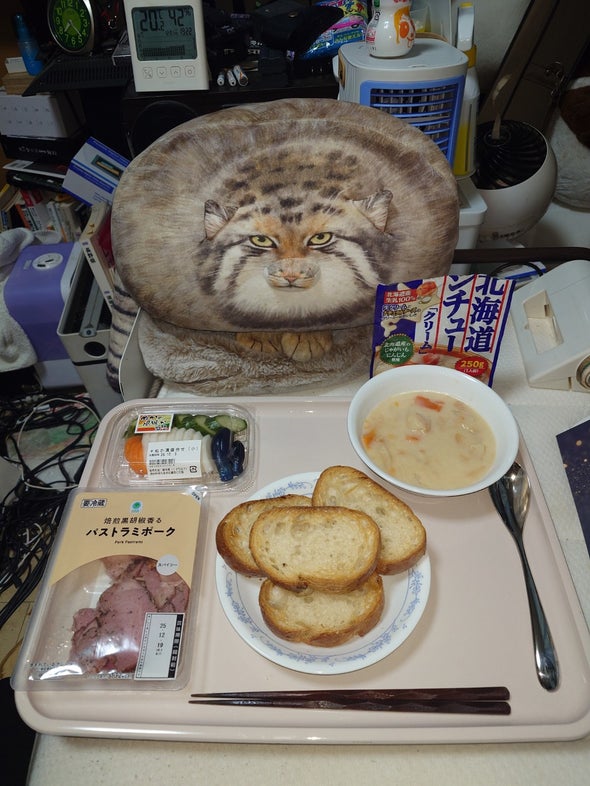 夕食:石窯ビストロフランス、北海道シチュー「クリーム」、パストラミポーク、ぬか漬盛合せ