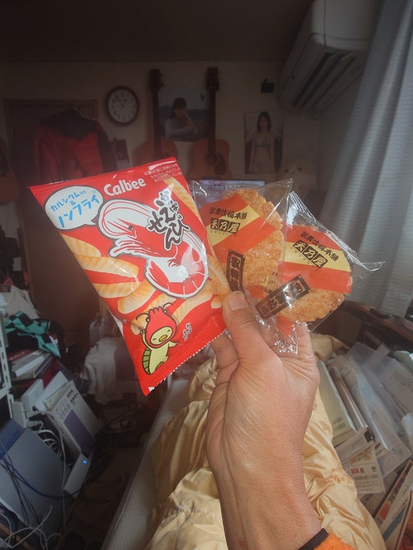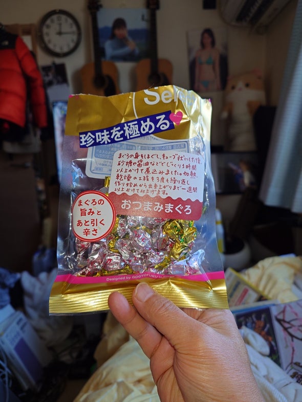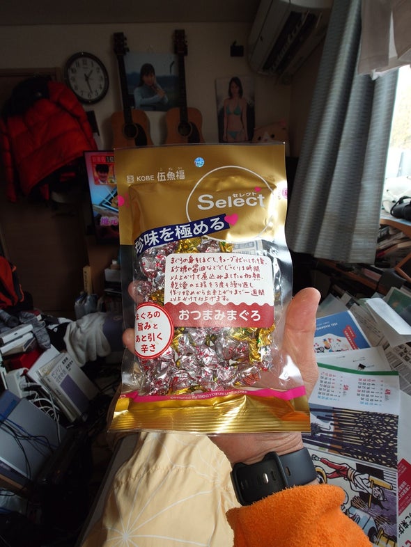 昼食:おつまみまぐろ、PREMIUM Ghana濃厚生チョコ、天乃屋の歌舞伎揚