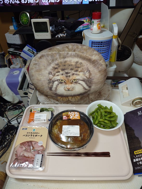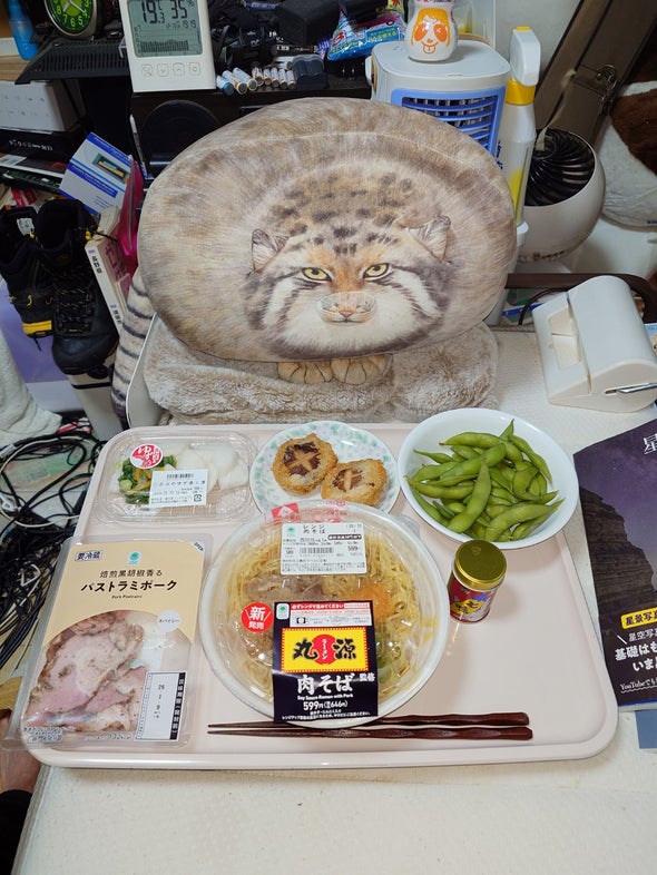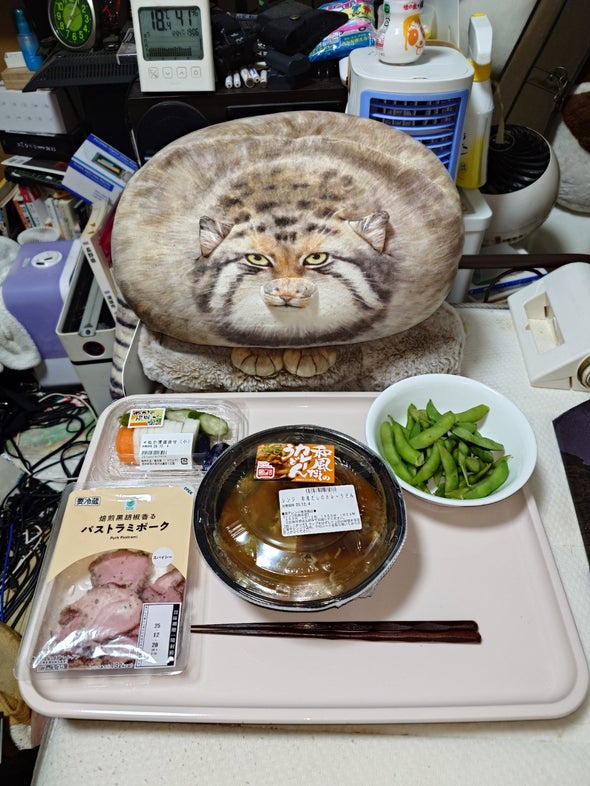 朝食:中華そば、豆腐と枝豆のひじき和え、リポビタンD、明治ブルガリアヨーグルトブルーベリーミックス、野菜一日これ一本