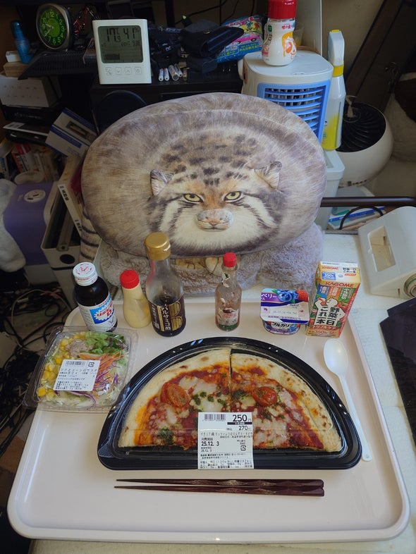 朝食:イタリア産モッツアレラのマルゲリータピザ、ツナとコーンのサラダ、リポビタンD、明治ブルガリアヨーグルトブルーベリーミックス、野菜一日これ一本