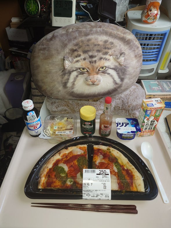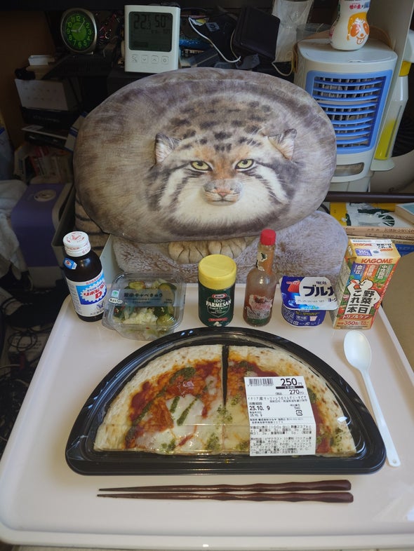 朝食:イタリア産モッツァレラのマルゲリータピザ、旨辛キャベきゅう、リポビタンD、明治ブルガリアヨーグルトブルーベリー、野菜一日これ一本