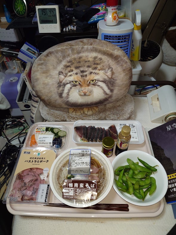 夕食:鴨南蛮そば、枝豆、かつお炭火焼たたき刺身、パストラミポーク、ぬか漬盛合せ