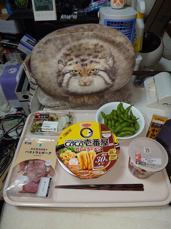 夕食:和風だしのカレーうどん、枝豆、パストラミポーク、ぬか漬盛合せ