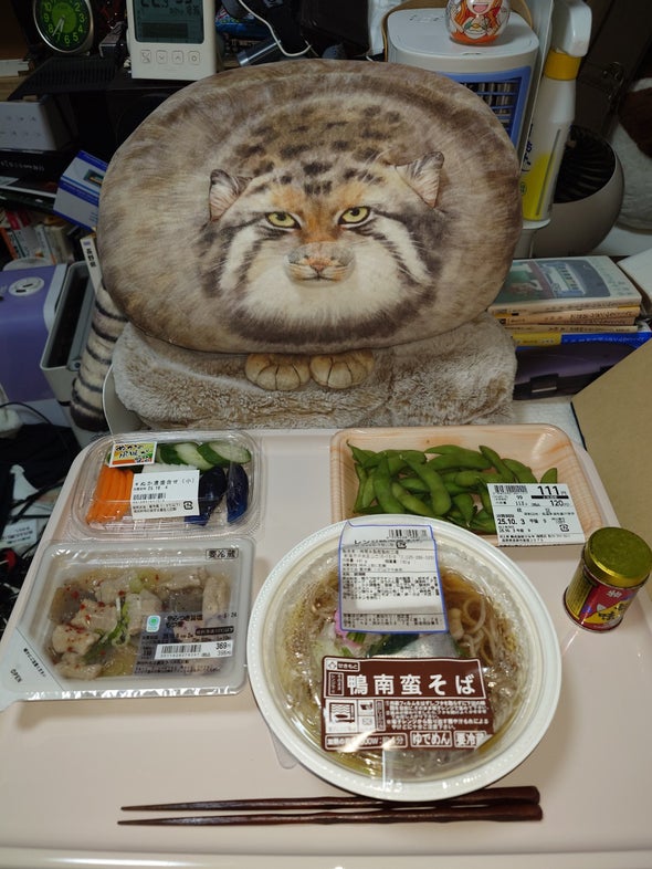 夕食:鴨南蛮そば、枝豆、やみつき旨塩もつ煮、ぬか漬盛合せ
