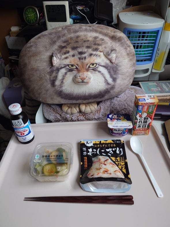 朝食:にぎらずにできるおにぎり、旨辛キャベきゅう、リポビタンD、明治ブルガリアヨーグルトブルーベリー、野菜一日これ一本