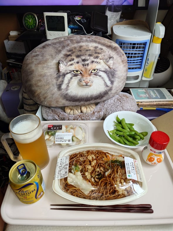 昼食:ジューシーソース焼そば、枝豆、昆布仕立てのセロリサラダ、ザ・プレミアム・モルツ生ビール(250ml)