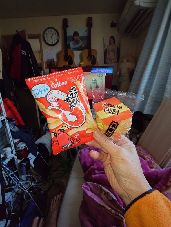 昼食:かっぱえびせん、天乃屋の歌舞伎揚げ、しっとり食感のやわらかいかくん